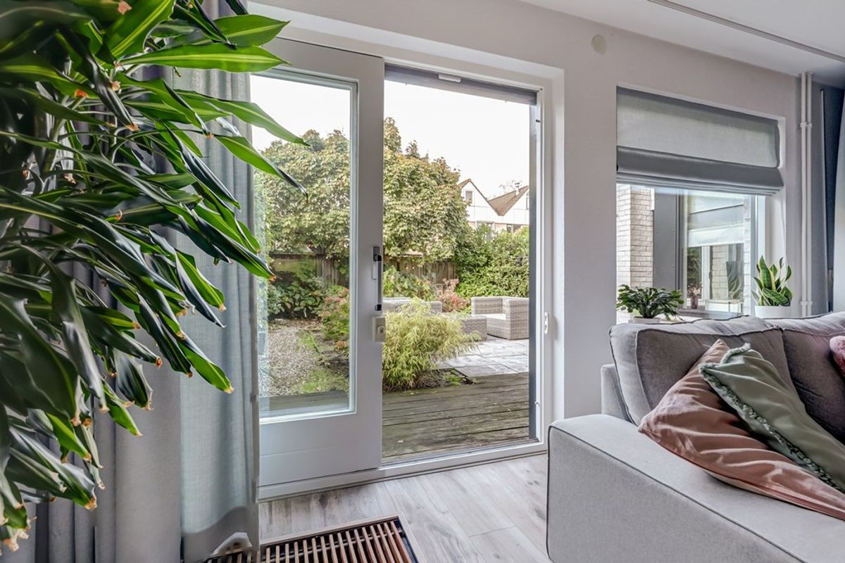De brede, besloten achtertuin ligt op het westen en biedt volop zon. De tuin is ca. 8,6 meter breed en 8,5 meter diep (gerekend vanaf de schuifpui) en beschikt over een achterom. Aan de achtergevel is een elektrisch bedienbaar zonnescherm geplaatst (2021).