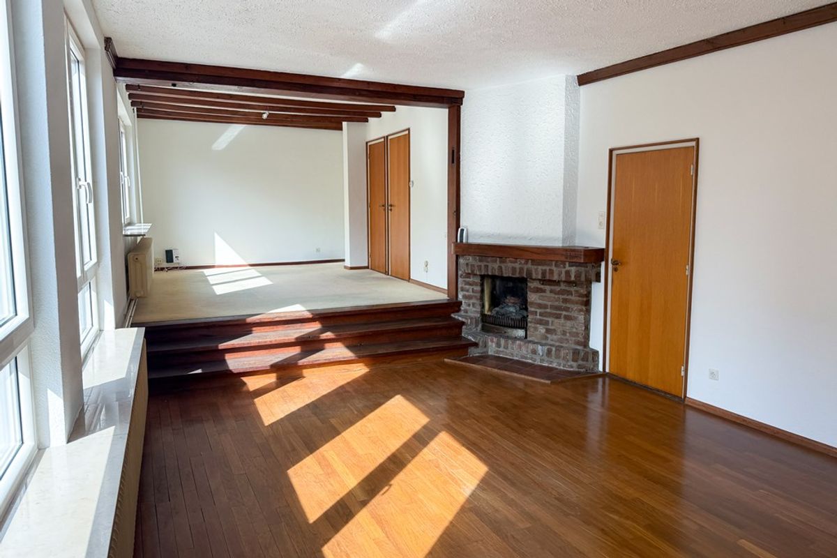 Het zitgedeelte op het lagere niveau heeft een karakteristieke sierhaard en staat in verbinding met een tussenhal die toegang biedt tot een slaapkamer (14 m²) met aangrenzend dakterras, en een extra kamer (6 m²) die geschikt is als wasruimte of extra slaapkamer.