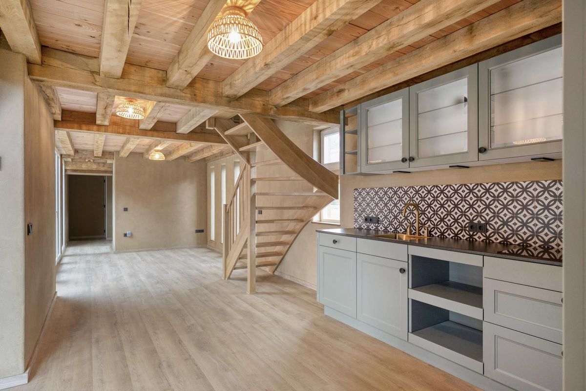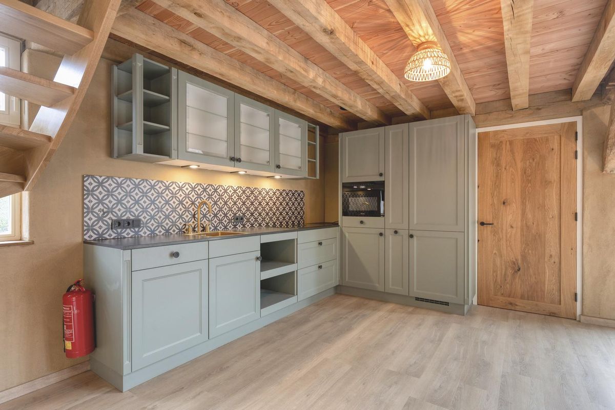 Tussen het zit- en het eetgedeelte is de keuken, waar een fraaie hoekopstelling staat. Deze keuken is een knipoog naar het verleden, qua kleur en stijl. Alle benodigde apparatuur is ingebouwd: een Bora inductie kookplaat met afzuiging, een vaatwasser, combi-oven, koelkast en een vriezer.