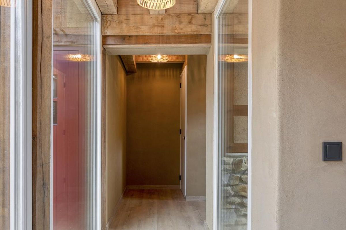 Aan de achterzijde van de woning is de entree, te herkennen aan het huisnummer en de rode voordeur. De aansluitende hal geeft direct weer dat dit een unieke woning is. Het houten balkenplafond, de binnendeuren, de houtlook pvc-vloer en de kleur op de wanden vormen een fraai geheel. Recht voor u is een inpandige berging met de warmtepomp en aansluiting voor de wasmachine.