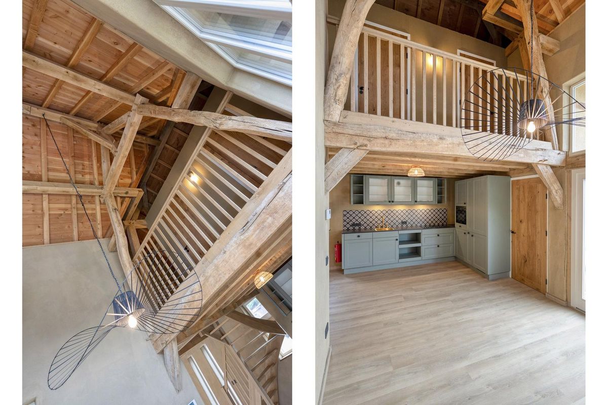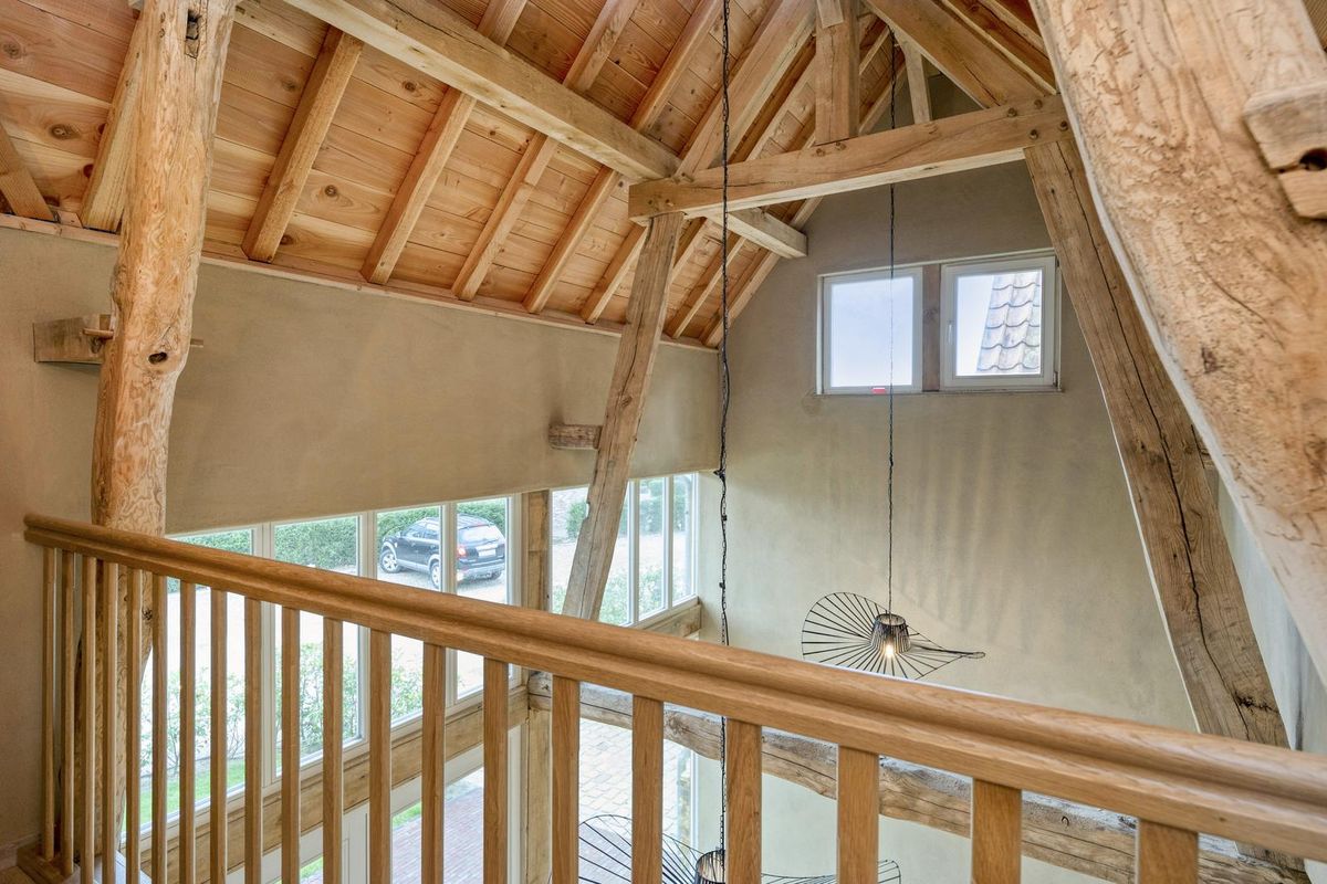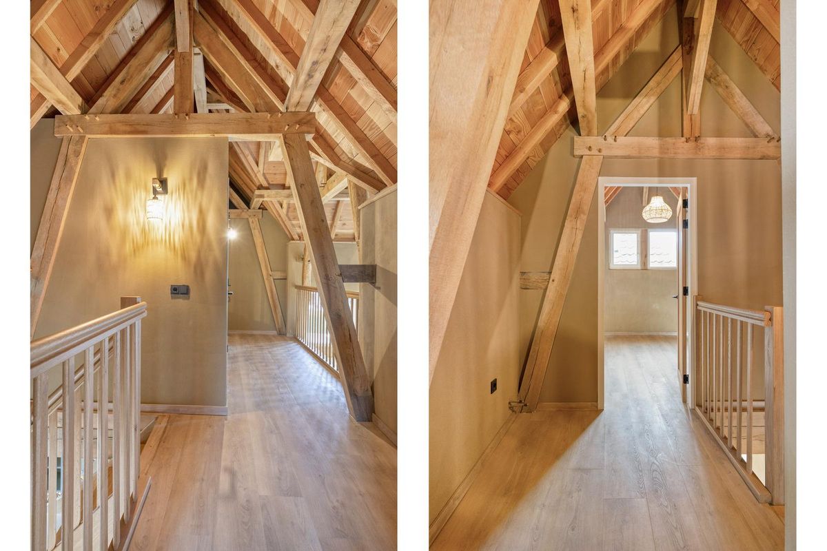 Volg de trap in de hal naar de eerste verdieping, met prachtig zicht tot in de nok. Ook hier ziet u de vakwerkconstructie met pen-gat verbindingen, leemstuc en mooie spanten. Vanaf de overloop heeft u toegang tot twee slaapkamers, die beiden circa 12.5 m² groot zijn. Grote ramen zorgen ervoor dat de kamers heel licht en ruimtelijk zijn, versterkt door de hoogte van het schuine dak.