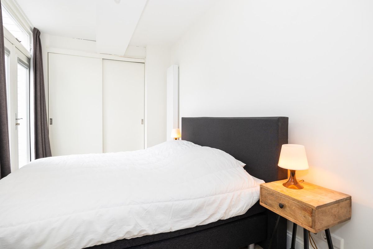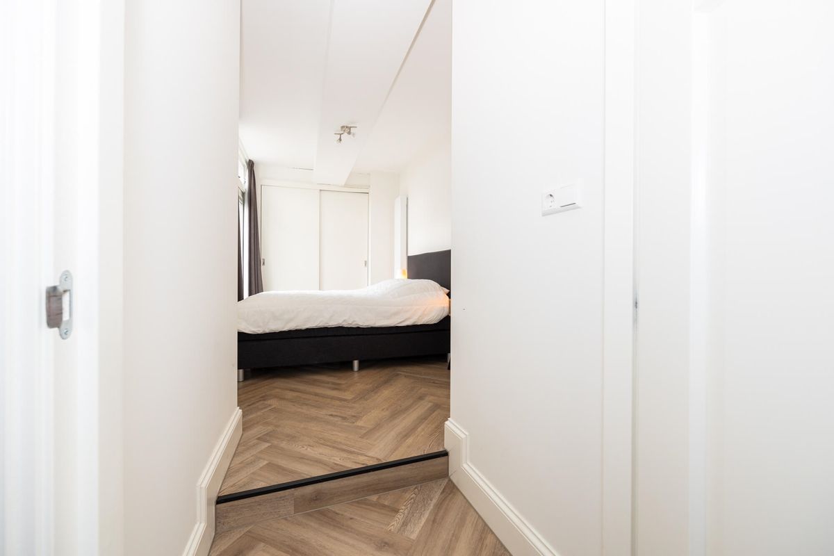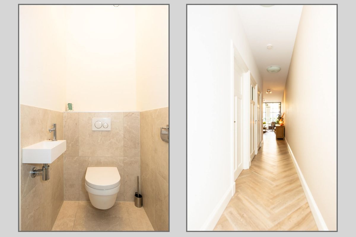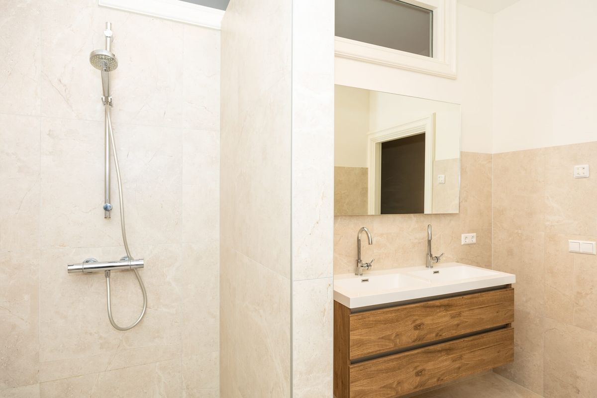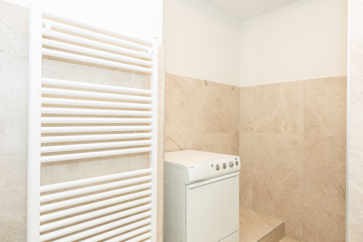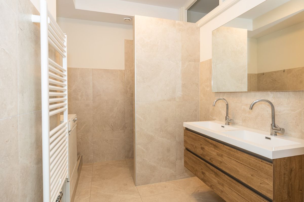 In het midden is het sanitaire blok gesitueerd met badkamer waarin een inloopdouche en wastafelmeubel met grote spiegel en designradiator zijn gecreëerd. Het toilet met wandcloset en fonteintje is apart. Ook is hier de opstelling van de wasmachine/droger.
