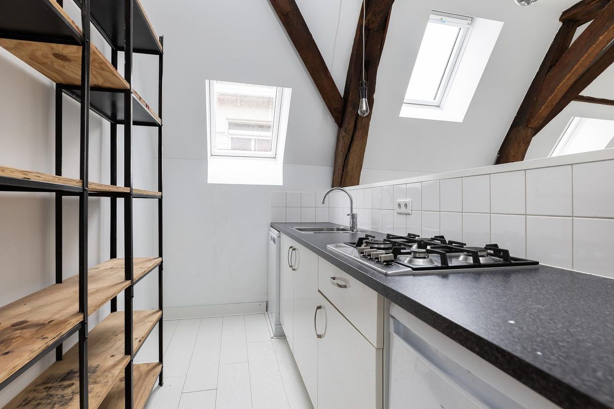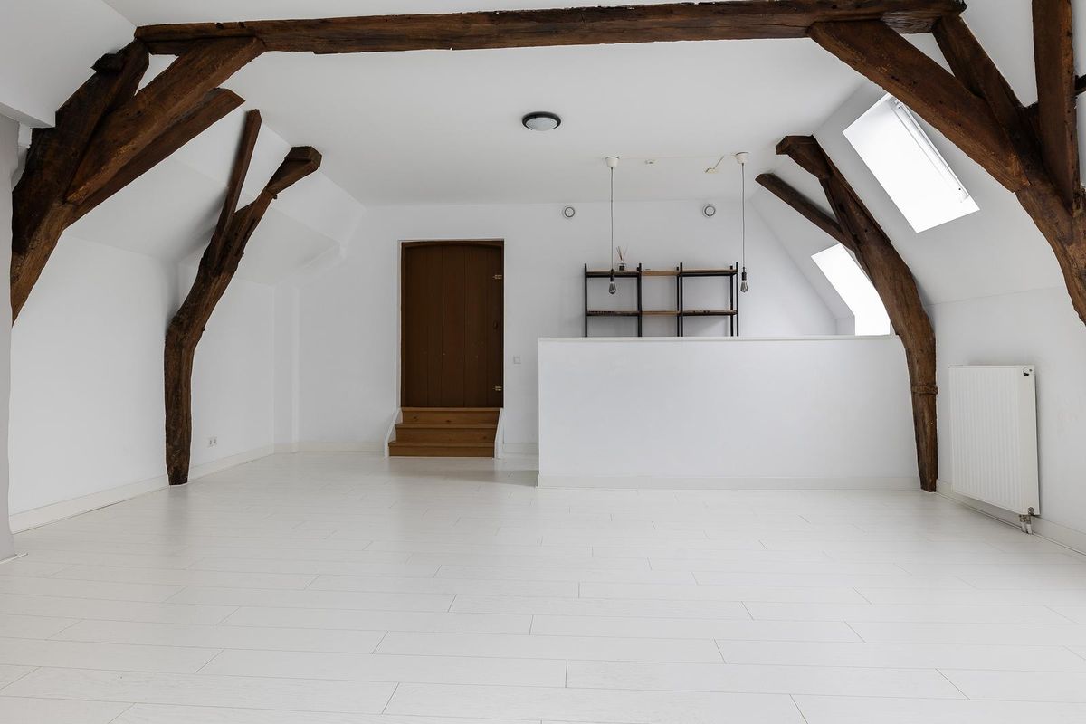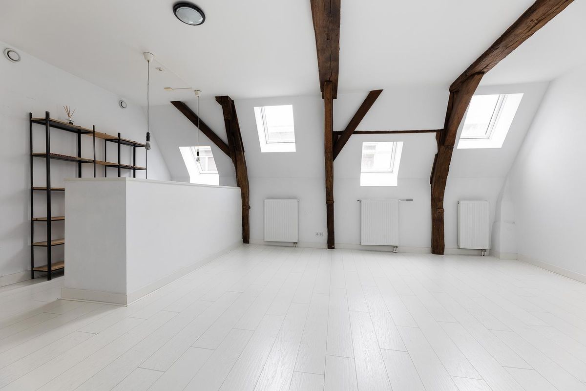 De woonkamer met open keuken is zonder twijfel het hart van dit appartement: een royale leefruimte met een indrukwekkend balkenplafond. De authentieke houten constructies geven de ruimte karakter en warmte, terwijl het strakke wit en de vele dakramen zorgen voor een lichte, frisse uitstraling.