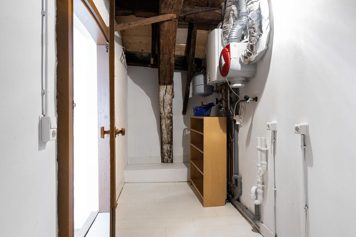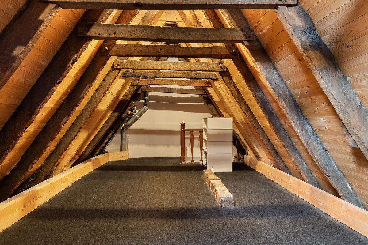 Achter de keuken ligt over de volledige breedte een extra berging: ideaal voor voorraad, een walk-in-closet of je hobby. Hier vind je ook de cv-ketel en de aansluiting voor de wasmachine. Via deze ruimte gaat een trap omhoog naar de verrassing van het huis: een zeer royale bergzolder tot in de nok. Bijzonder is dat dit waarschijnlijk het oudste particuliere dak van Kampen is, geplaatst in 14e eeuw (en toen al meer dan 100 jaar oud!).