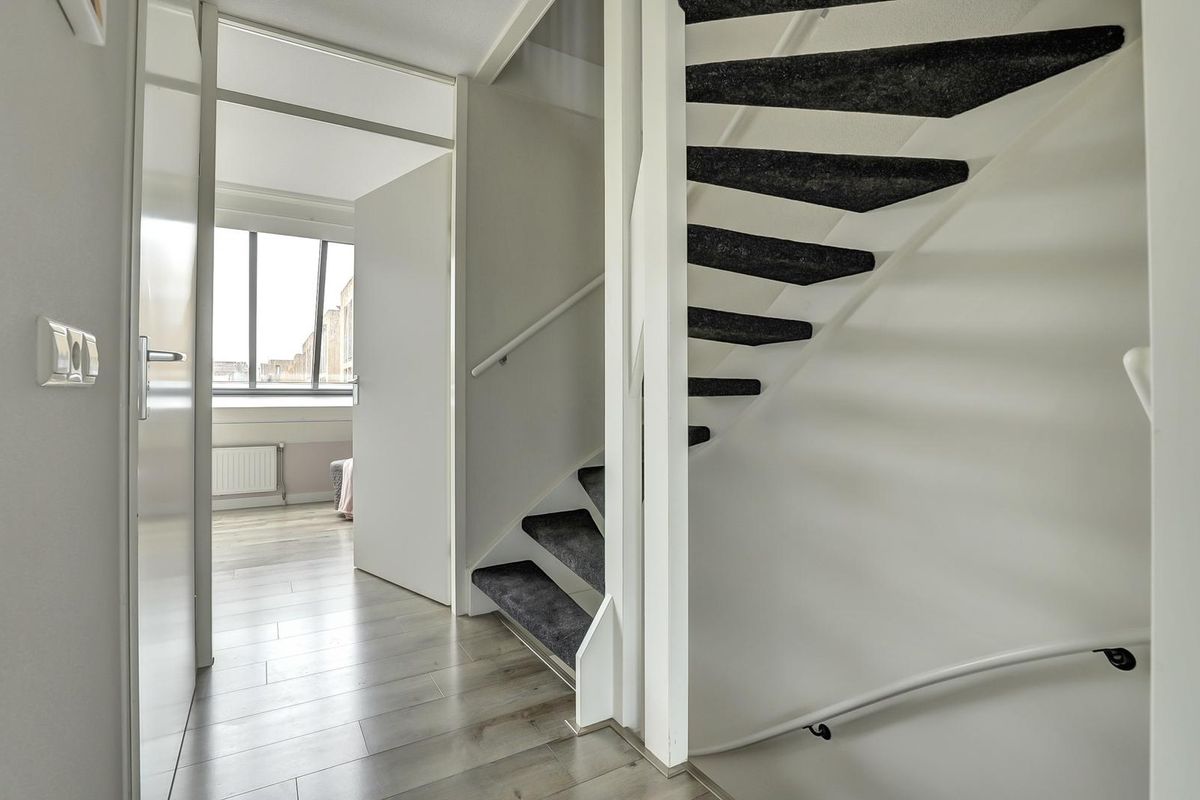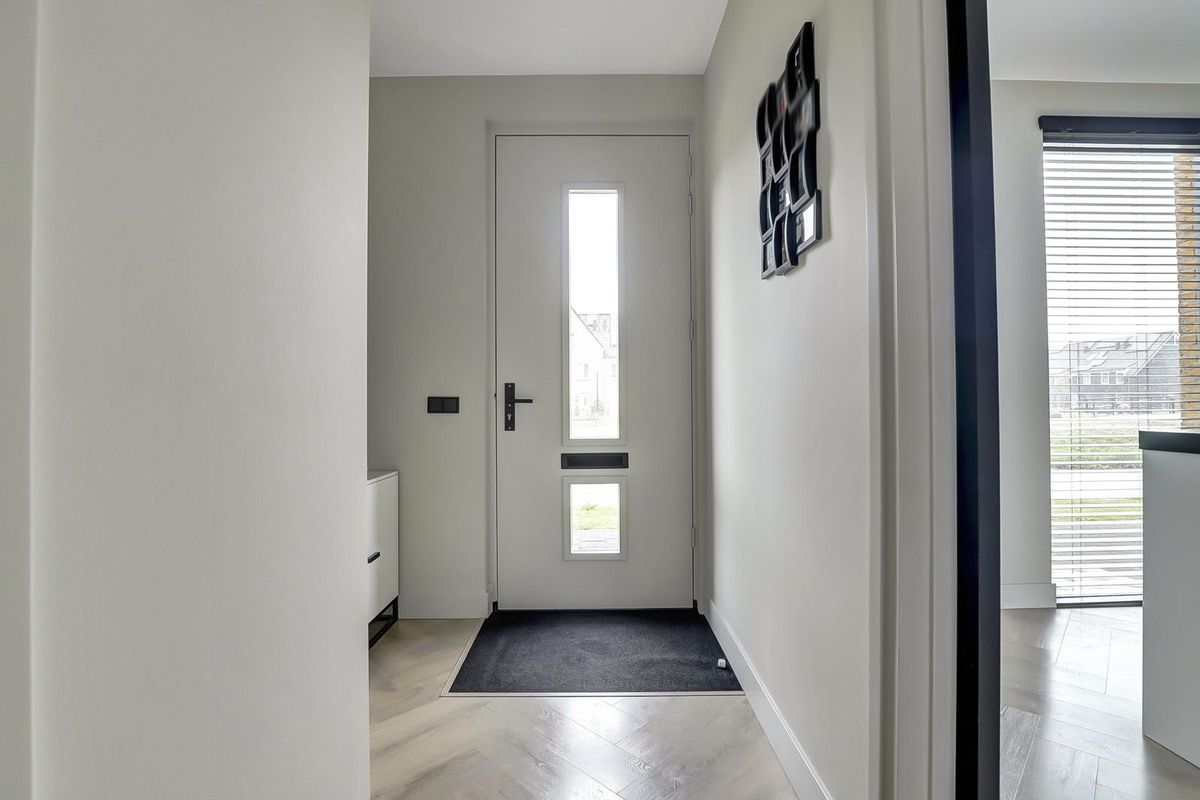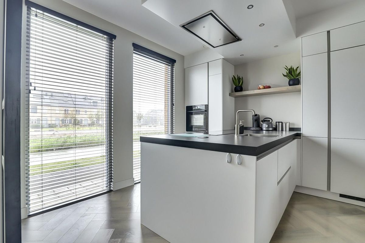 Bij binnenkomst tref je de entree met in de hal het luxe toilet, ruimte voor de garderobe en de meterkast. Via een praktische schuifdeur kom je in de ruime woonkamer. Dankzij de brede opzet en de grote ramen is dit een bijzonder lichte leefruimte, met een handige trapkast voor extra opbergruimte. Aan de voorzijde bevindt zich de luxe open keuken, compleet uitgerust met diverse inbouwapparatuur en een strakke afwerking. Terwijl je kookt, geniet je hier van een heerlijk vrij uitzicht over het water. Aan de achterzijde is het zitgedeelte gesitueerd, met een loopdeur naar de tuin.