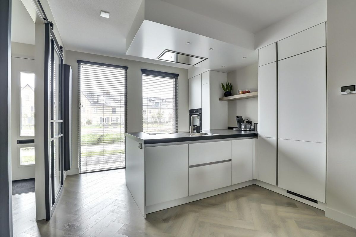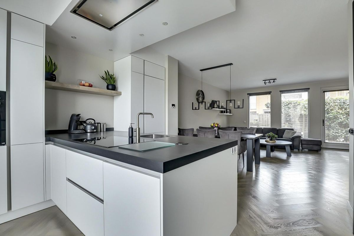 Luxe open keuken met inbouwapparatuur: een koelkast, een vriezer, een combi-magnetron, een inductie kookplaat, een afzuigkap en een vaatwasser.