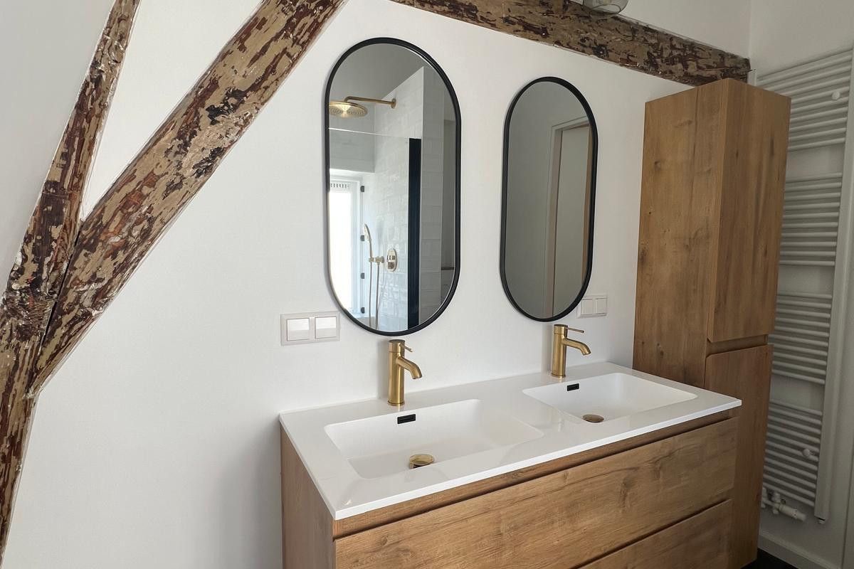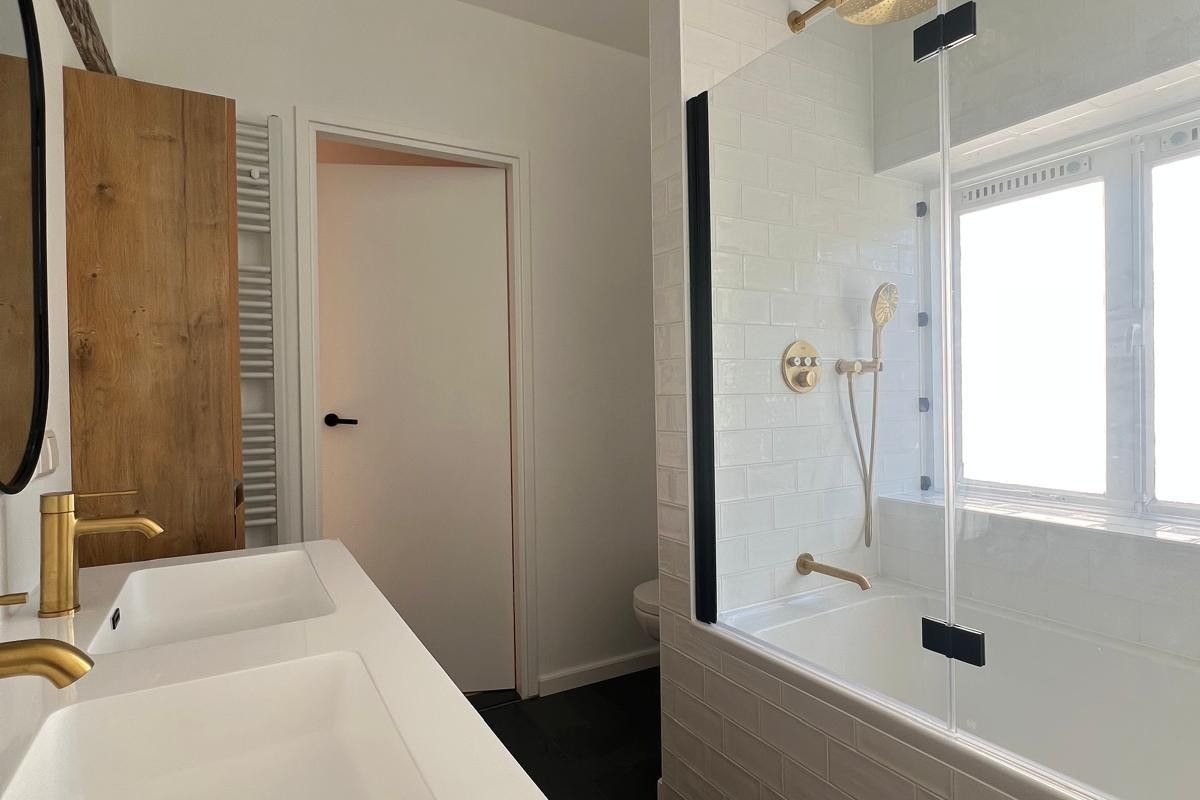 * Volledige badkamer met inloopregendouche, wasmachine, droger en koperen kranen