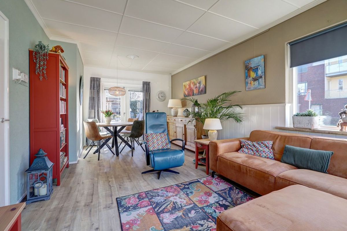 De woonkamer is heerlijk licht dankzij het extra zijraam en de openslaande deuren naar de tuin. Een fijne plek om te ontspannen, met een praktische laminaatvloer en een open verbinding naar buiten op zonnige dagen.
