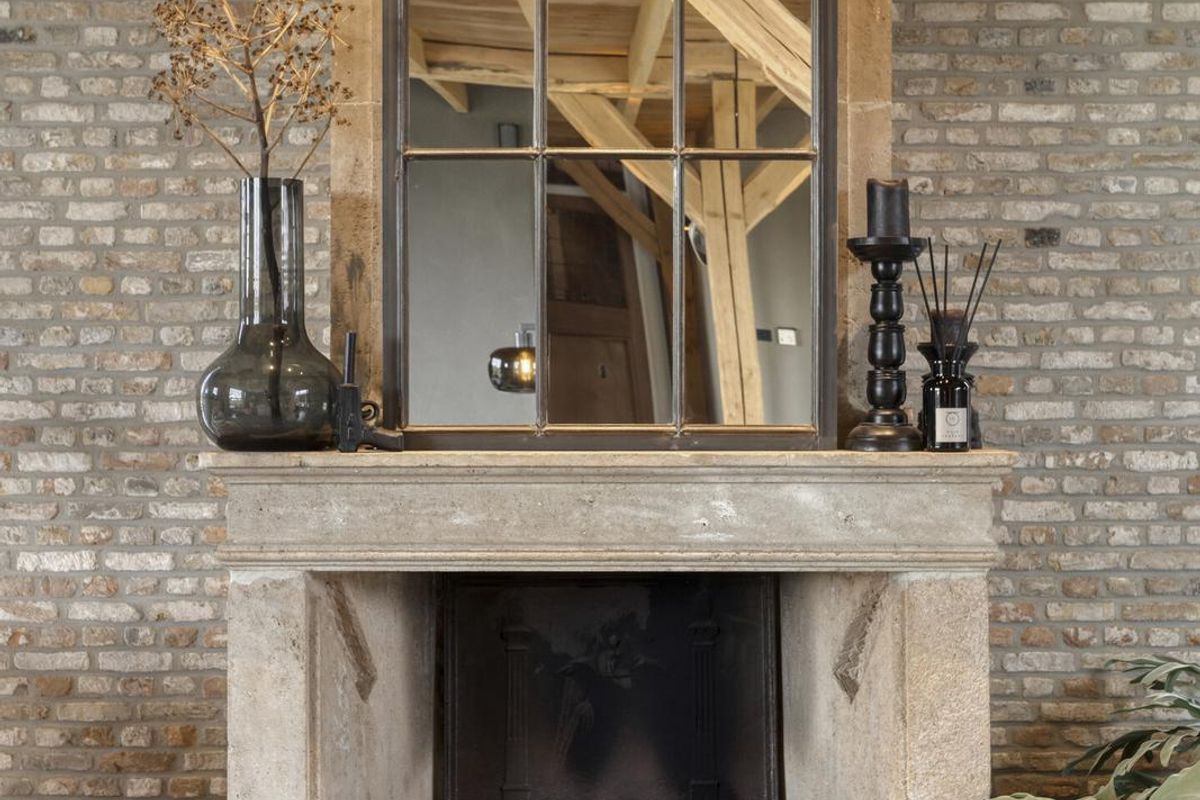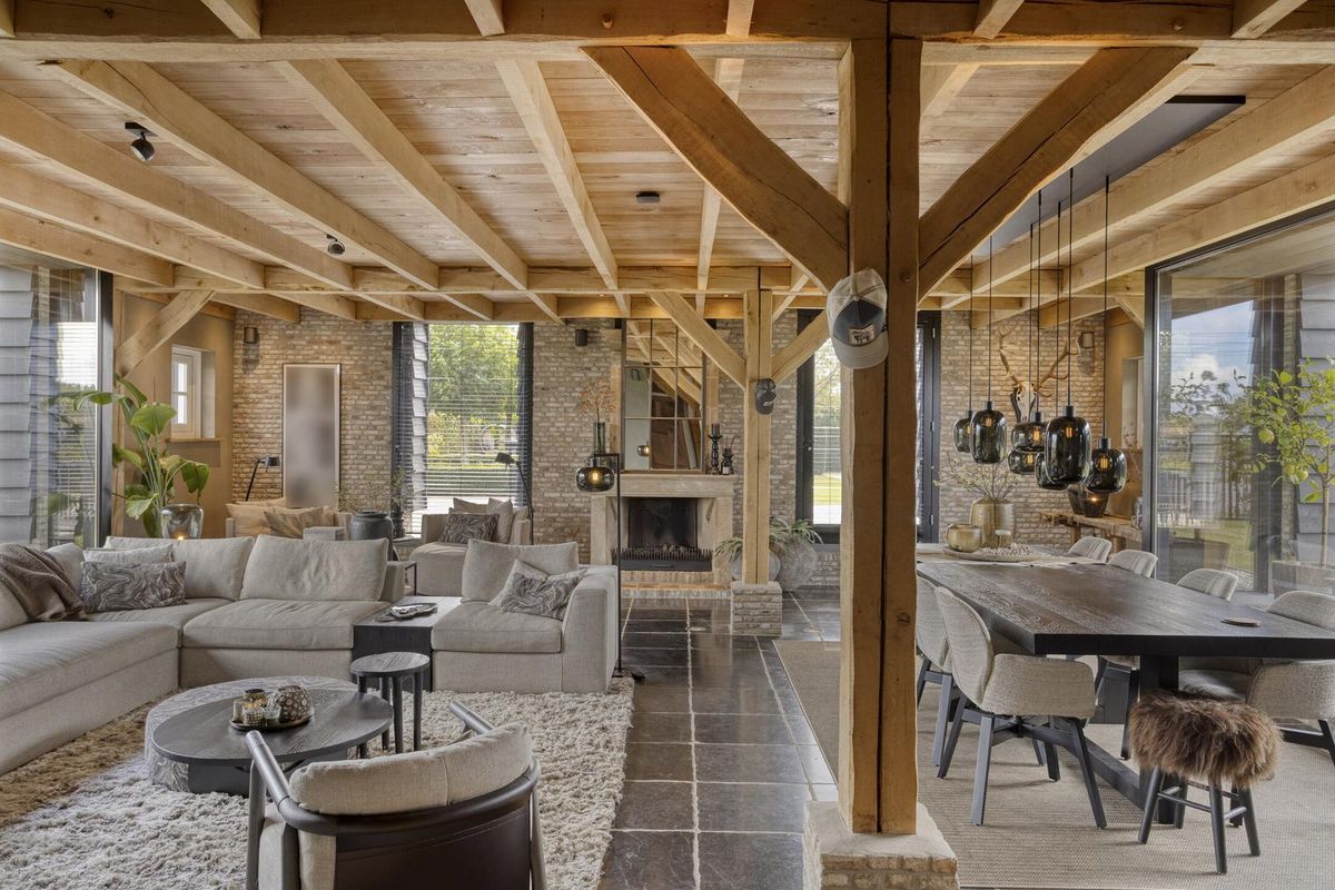 De woonkamer straalt warmte en karakter uit dankzij het prachtige balkenplafond, de sfeervolle gashaard en de combinatie van leemstuc en schoonmetselwerk wanden.