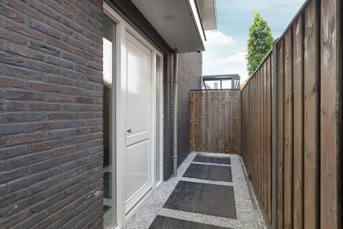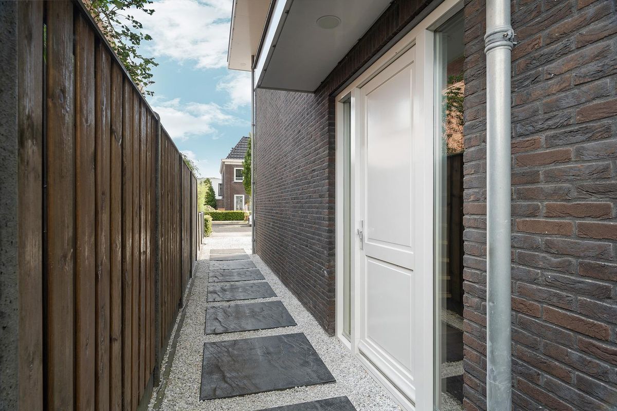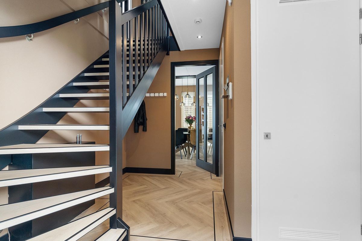 Bij binnenkomst via de zijentree kom je in een lichte hal met hoog plafond, die naast toegang tot de moderne toiletruimte, de meterkast en de ruime woonkamer ook toegang biedt tot de bijkeuken. De open trap, in 2023 gerenoveerd, is een blikvanger en leidt je stijlvol naar de bovenverdieping. Het schilderwerk in de hal is eveneens in 2023 vernieuwd en afgewerkt met geïntegreerde spots, wat zorgt voor een frisse, moderne uitstraling. De PVC-vloer met band en bies draagt bij aan het luxe gevoel.