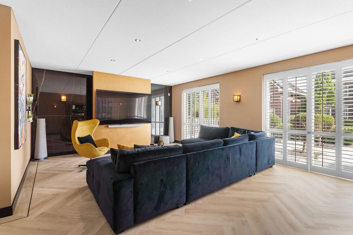 De woonkamer is royaal en licht, met grote raampartijen die zorgen voor veel daglicht en voorzien zijn van sfeervolle shutters. Een klassieke cinewall met volop verborgen bergruimte vormt hier een stijlvol en functioneel middelpunt. Het wandpaneel achter de cinewall is van natuursteen, wat een extra luxe en eigentijdse sfeer toevoegt. De airco zorgt ook op warme dagen voor een prettig binnenklimaat zoals de vloerverwarming dat op koudere dagen doet.