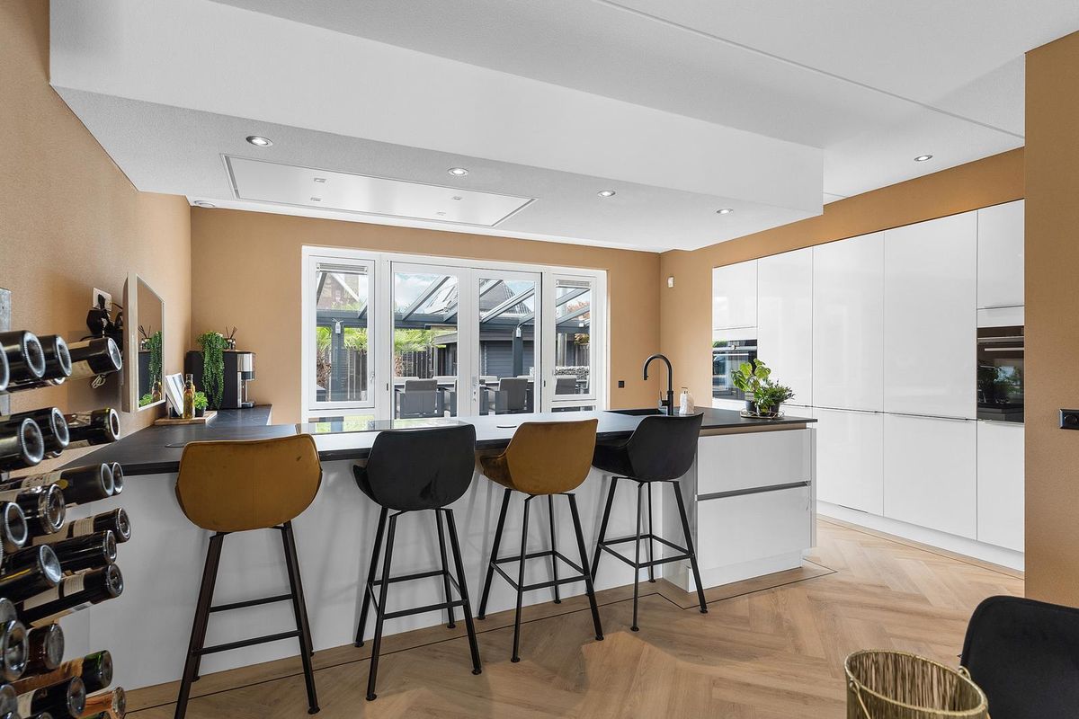 De moderne leefkeuken is het kloppend hart van de woning. Deze is in 2023 volledig vernieuwd en uitgerust met hoogwaardige inbouwapparatuur zoals twee combi-ovens met stoomfunctie, een inductiekookplaat, TV (optioneel), Quooker, vaatwasser, een stijlvol werkblad en een moderne spoelbak. Dankzij het centrale kookeiland is dit de ideale plek om samen te koken en te genieten. Via openslaande deuren heb je direct toegang tot de tuin en de glazen serre met zeer complete buitenkeuken (2023) die desgewenst in zijn geheel over te nemen is. Vanuit de bijkeuken waar zich tevens de wasmachine en droger aansluiting bevindt, is er tevens een tweede toegang tot de tuin.
