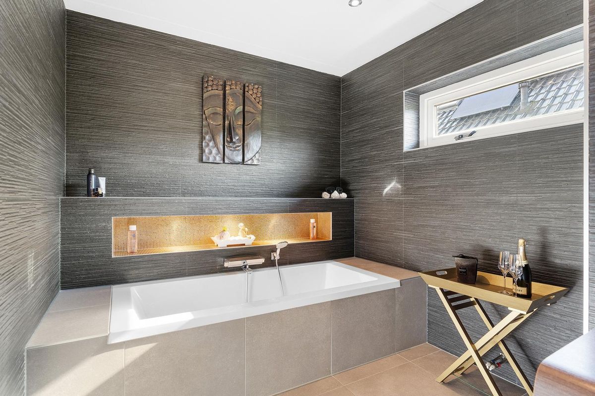 De badkamer is een eyecatcher: riant van formaat en uitgevoerd met luxe materialen, moderne voorzieningen en vloerverwarming. De badkamer is voorzien van een raam voor frisse lucht en slim geplaatst waardoor privacy gewaarborgd is. Je vindt hier een royale inloopdouche, een bad, toilet, een stijlvol wastafelmeubel met dubbele wasbak en mooie afwerkingen met nissen en sfeerverlichting – een plek waar je elke dag kunt ontspannen in een sfeer van wellness en comfort.
