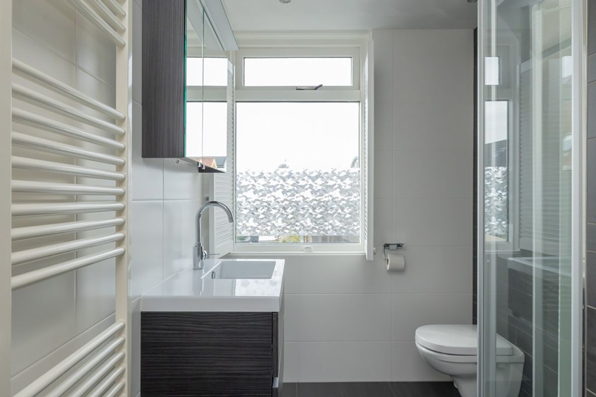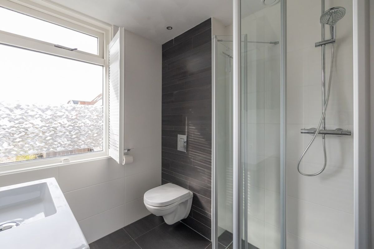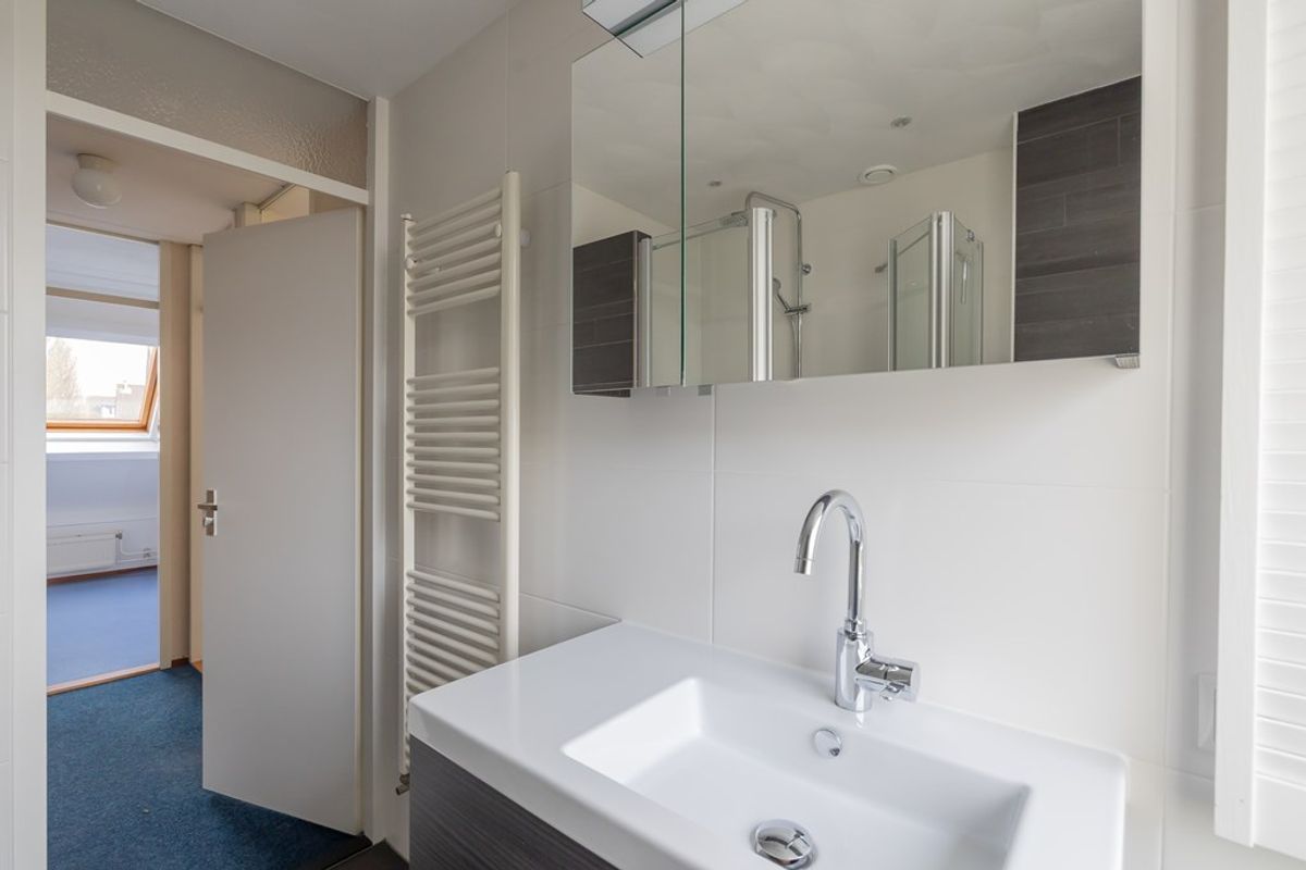 Overloop, aan de voorzijde ligt de eerste slaapkamer, de fraaie betegelde badkamer heeft een wastafelmeubel, een wandcloset, een douchecabine, ingebouwde verlichting en een spiegelkast. De eerste ruime slaapkamer is gelegen aan de voorzijde, aan de achterzijde zijn er twee slaapkamers beide met een dakraam. Deze verdieping is volledig voorzien van dubbele beglazing.