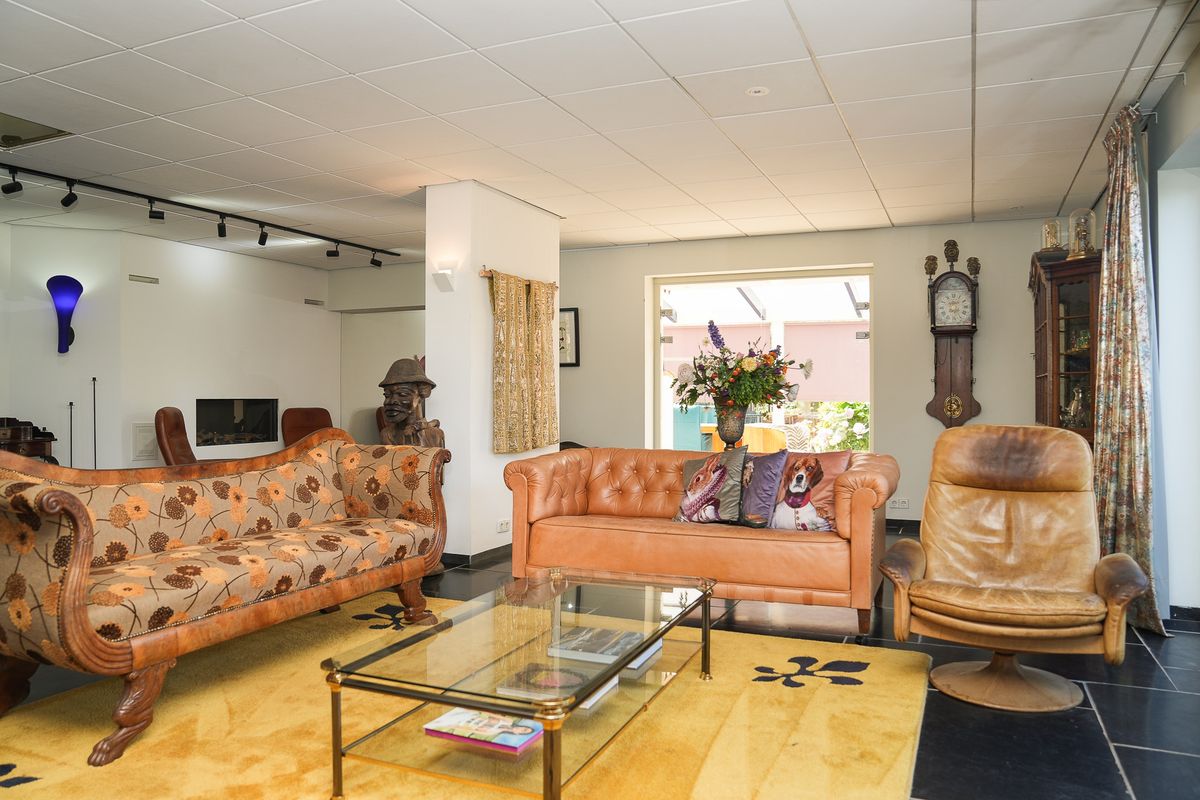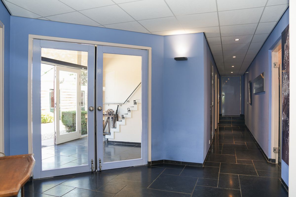 Via de lange oprit langs het voorhuis kom je uit bij de entree van het woonhuis. Op de plaats waar de oorspronkelijke hooideuren zaten is een imposante glazen gevel gekomen die de hal en trapopgang markeert. Hierdoor ervaar je meteen het ruimtelijke karakter van dit huis. De hal is licht en royaal, met aan de linkerzijde een erg ruim toilet . Vervolgens betreed je via de lange gang de woonkamer: een riante leefruimte met grote raampartijen, meerdere zithoeken, een Harrie Leenders houtkachel en dubbele tuindeuren naar het aangrenzende terras