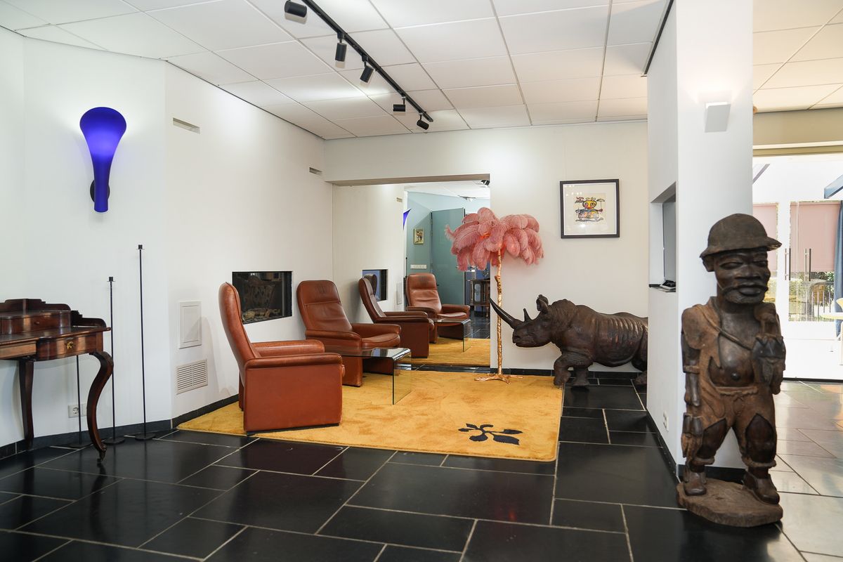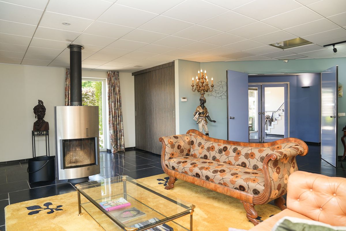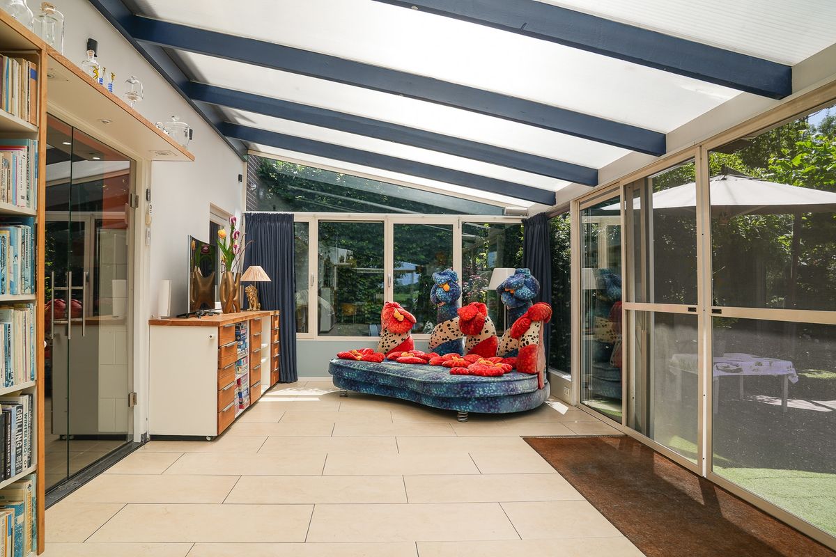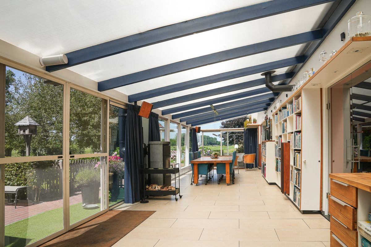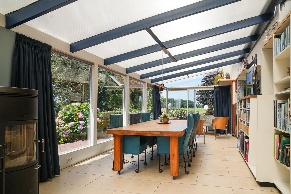 Aan de andere zijde van de woning ligt de aangrenzende serre/tuinkamer van ruim 60 m2. Deze ruimte is rondom voorzien van glas, waardoor je vanuit iedere hoek contact houdt met de tuin, boomgaard en het achterliggende landschap. Er is ruimte voor een lange eettafel, een leestafel of een creatieve werkplek. De prachtige speksteenkachel zorgt - los van de vloerverwarming -voor comfort in de winter, de zonwering doet datzelfde in de zomer.
