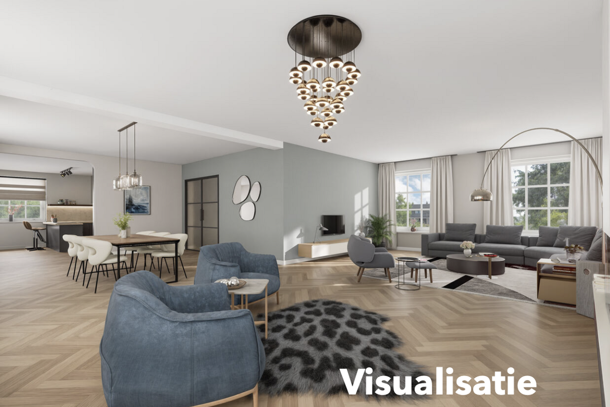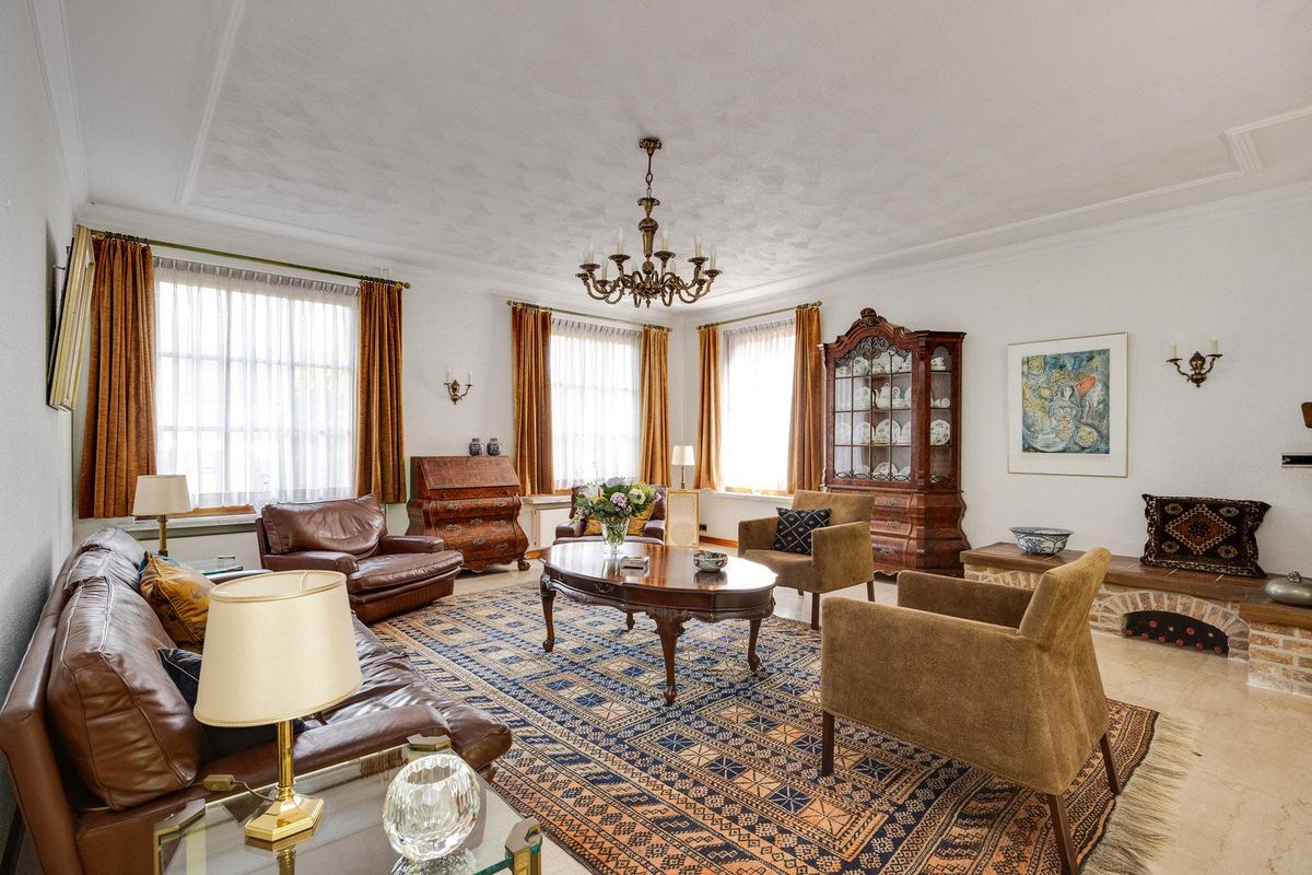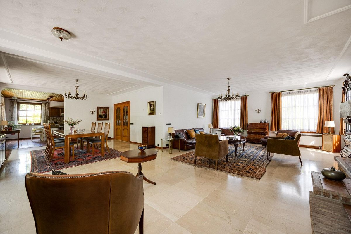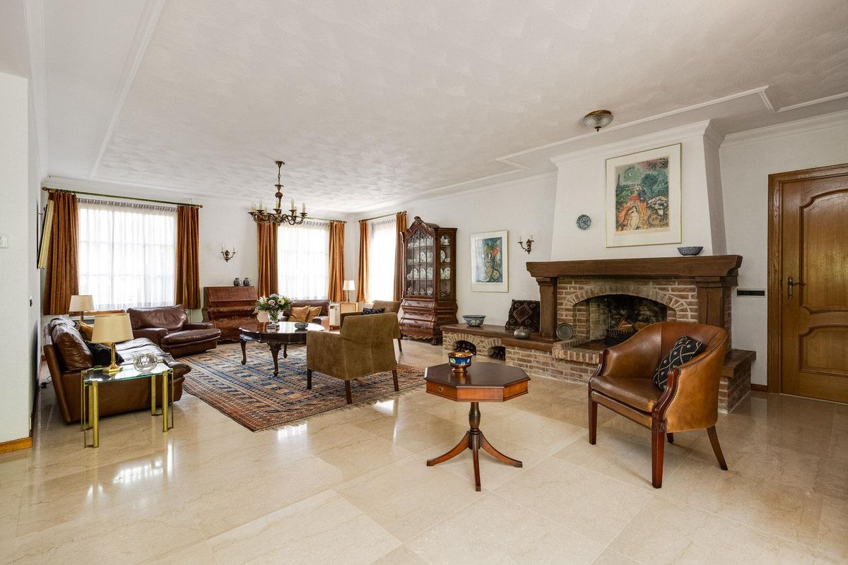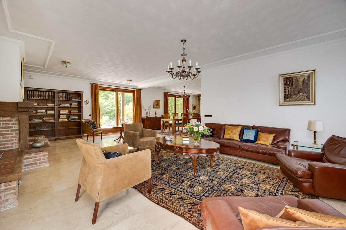 De living is voorzien van marmeren vloertegels in een lichte kleurstelling en voorzien van vloerverwarming. De living biedt voldoende ruimte voor een zit- en eetgedeelte en beschikt over een prettige daglichtinval door de vele raampartijen. De sfeer wordt versterkt door het fraaie zicht over de tuin. De schuifpuien aan de achterzijde zorgen voor een directe verbinding met het overdekte terras en de achtertuin. Centraal in de living is er een fraaie schouw met open houthaard aanwezig.