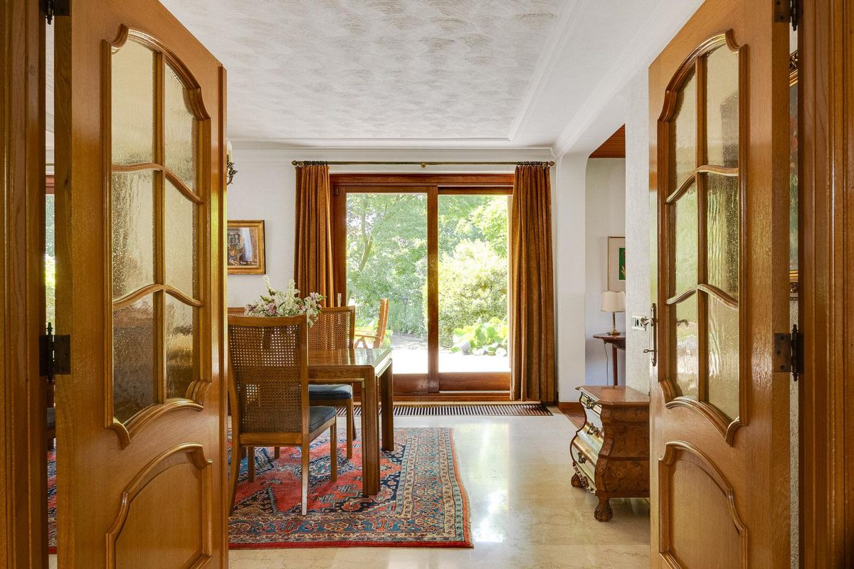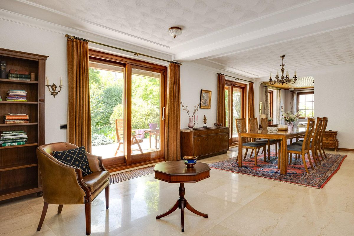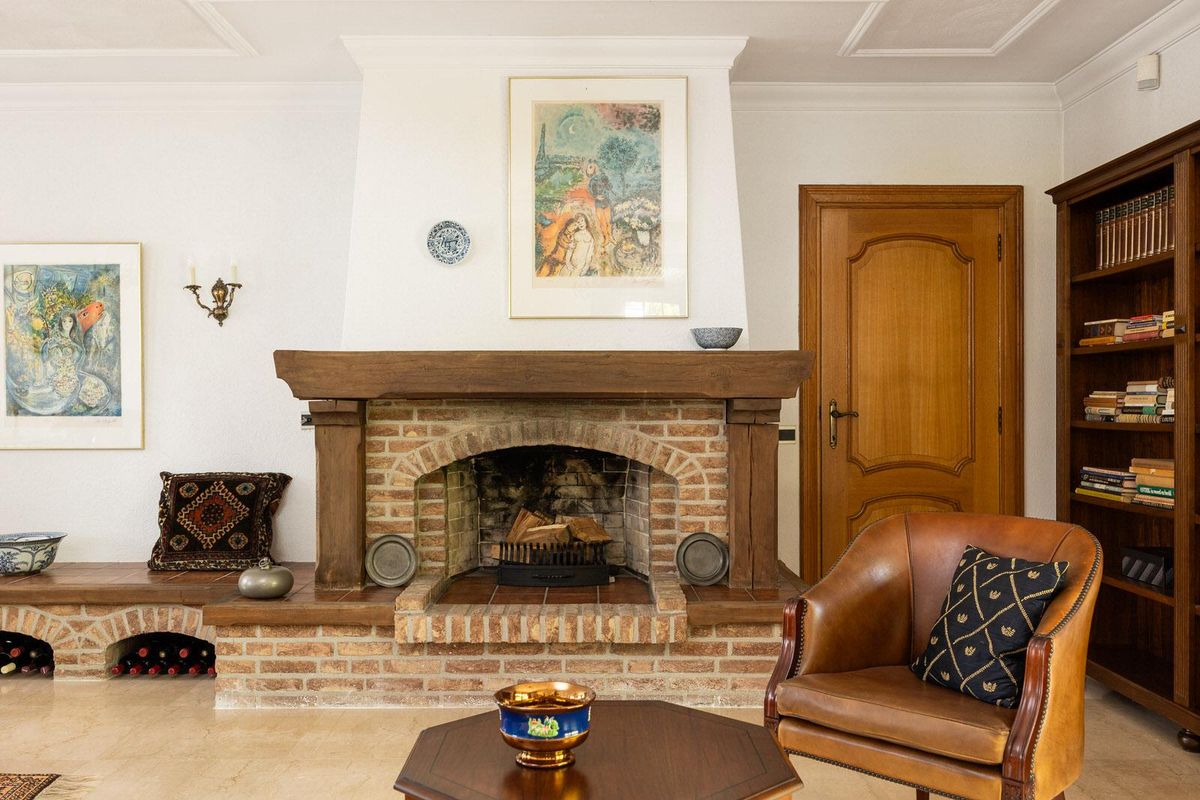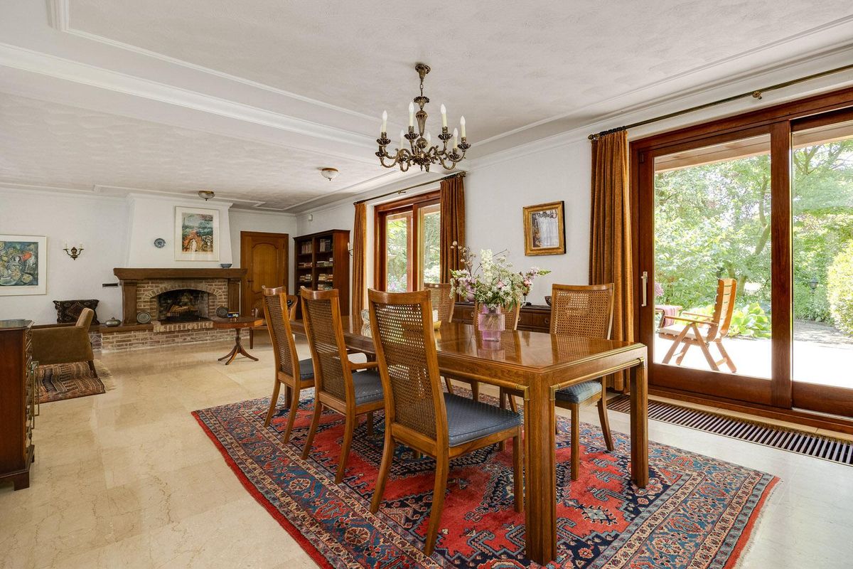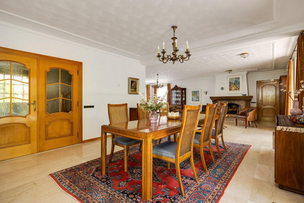 De living is voorzien van marmeren vloertegels in een lichte kleurstelling en voorzien van vloerverwarming. De living biedt voldoende ruimte voor een zit- en eetgedeelte en beschikt over een prettige daglichtinval door de vele raampartijen. De sfeer wordt versterkt door het fraaie zicht over de tuin. De schuifpuien aan de achterzijde zorgen voor een directe verbinding met het overdekte terras en de achtertuin. Centraal in de living is er een fraaie schouw met open houthaard aanwezig.