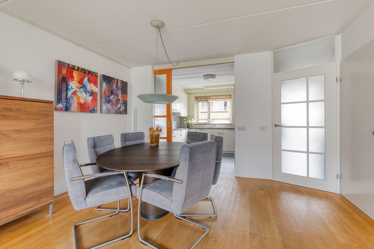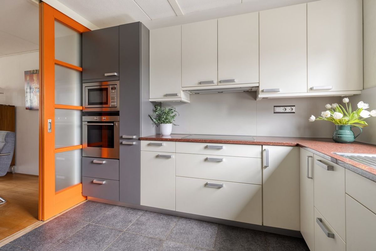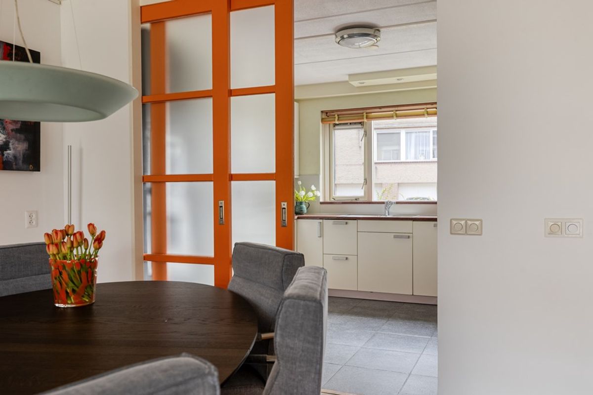 Aan de voorzijde ligt de open keuken, praktisch ingericht en voorzien van onder andere een vaatwasser, keramische kookplaat en koel-/vriescombinatie. Door dus de schuifdeur is deze ruimte indien gewenst ook af te sluiten. Alles bij elkaar een heerlijke begane grond waar koken, eten en ontspannen vanzelf in elkaar overlopen. Door naar de tuin.