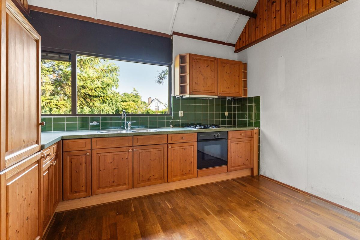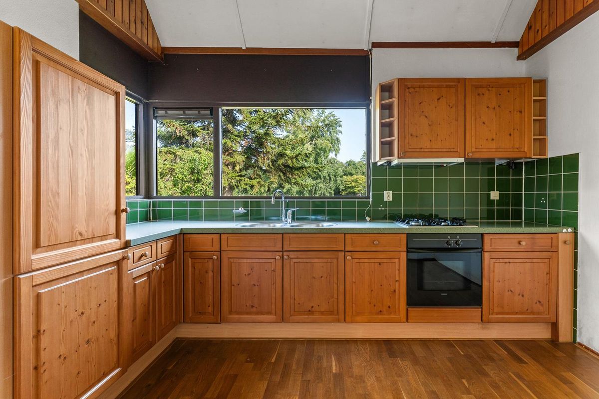 Aan de achterzijde bevindt zich de open keuken. De keuken, in praktische hoekopstelling en is uitgerust met diverse inbouwapparatuur zoals een koelkast, vriezer, oven en gasfornuis.