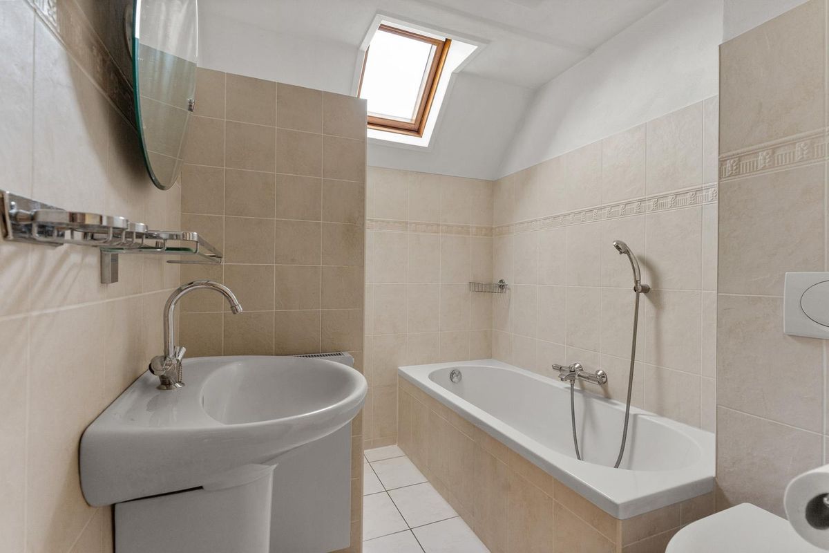 Via de vaste trap bereikt u de eerste verdieping. De overloop geeft toegang tot drie slaapkamers en de badkamer. De nette badkamer is tot aan het plafond betegeld en uitgerust met een inloopdouche, ligbad, wastafel en toilet.
