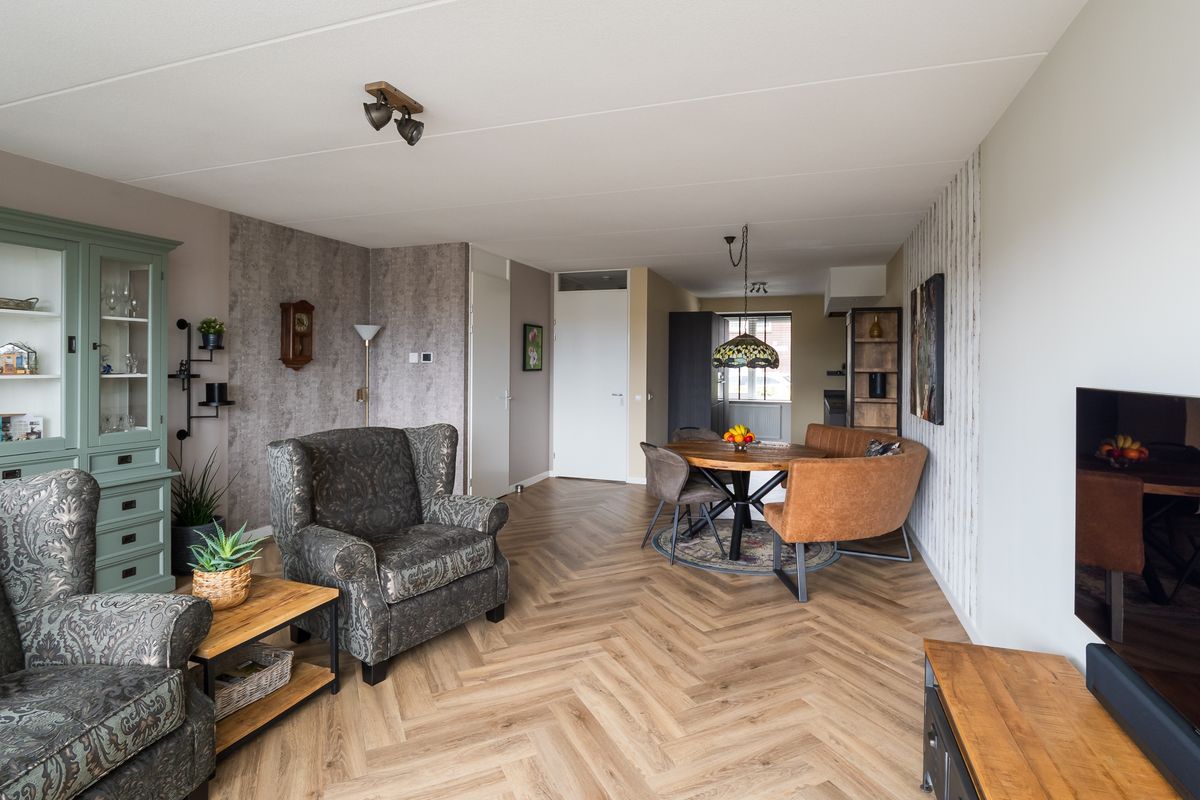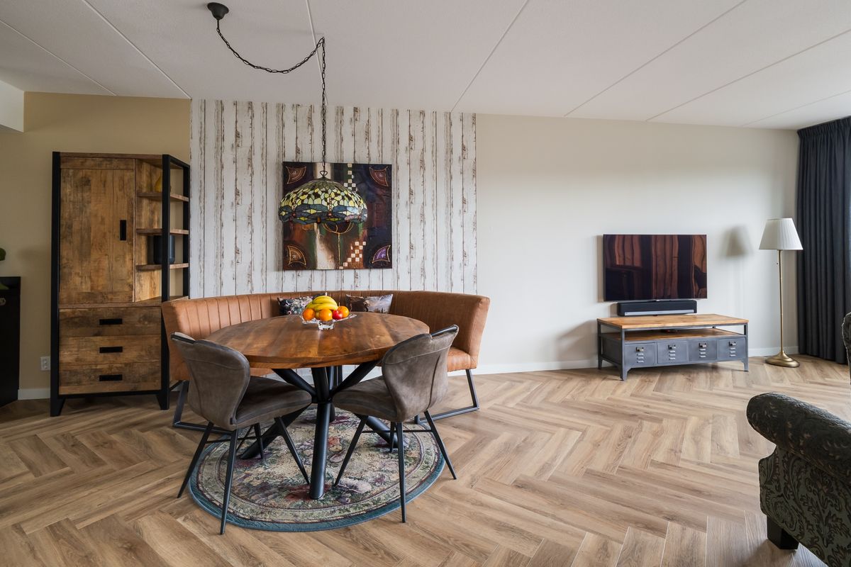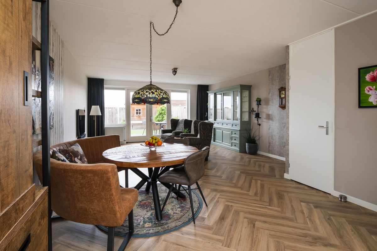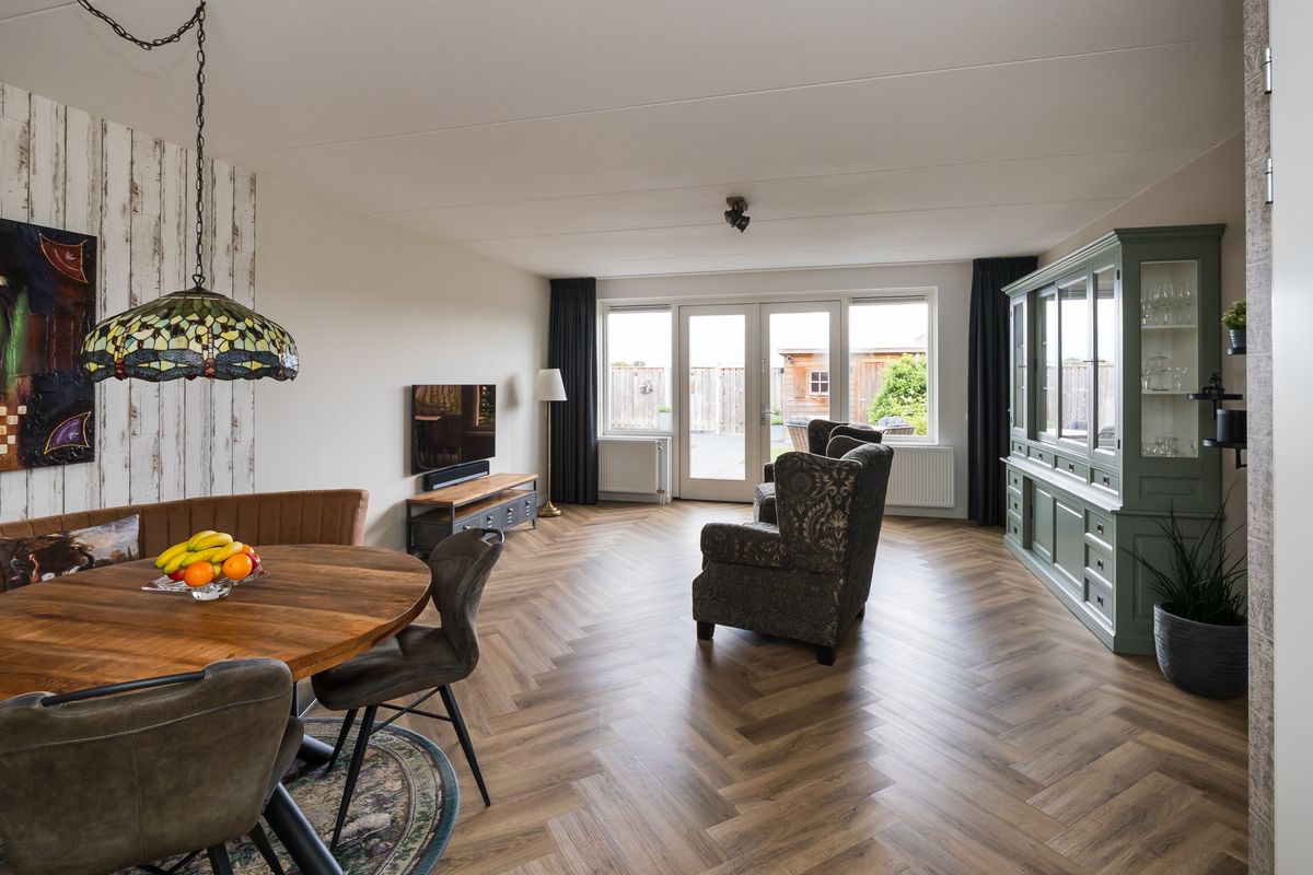 De living voelt dankzij de uitbouw riant en licht. De grote glaspui met openslaande deuren zorgt voor een dynamische verbinding met de achtertuin en laat het daglicht volop binnenstromen. Het ruime vloeroppervlak geeft je de vrijheid om te spelen met je interieur; meerdere opstellingen zijn hier moeiteloos mogelijk. Praktisch is de trapkast, voorzien van legplanken, die veel opbergruimte biedt.