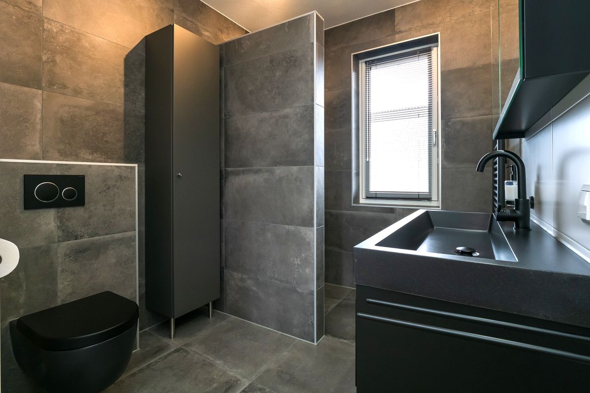 De badkamer straalt luxe en comfort uit. Strakke betonlook tegels vormen de basis, gecombineerd met stijlvol zwart sanitair en kranen. In de ruime inloopdouche met thermostaatkraan geniet je van een verfrissende douche-beleving, terwijl de praktische nis voor shampoo en douchegel alles netjes binnen handbereik houdt. Het wastafelmeubel met twee laden en de spiegelkast daarboven bieden opbergruimte. Het wandcloset en de designradiator maken de inrichting van deze badkamer compleet.