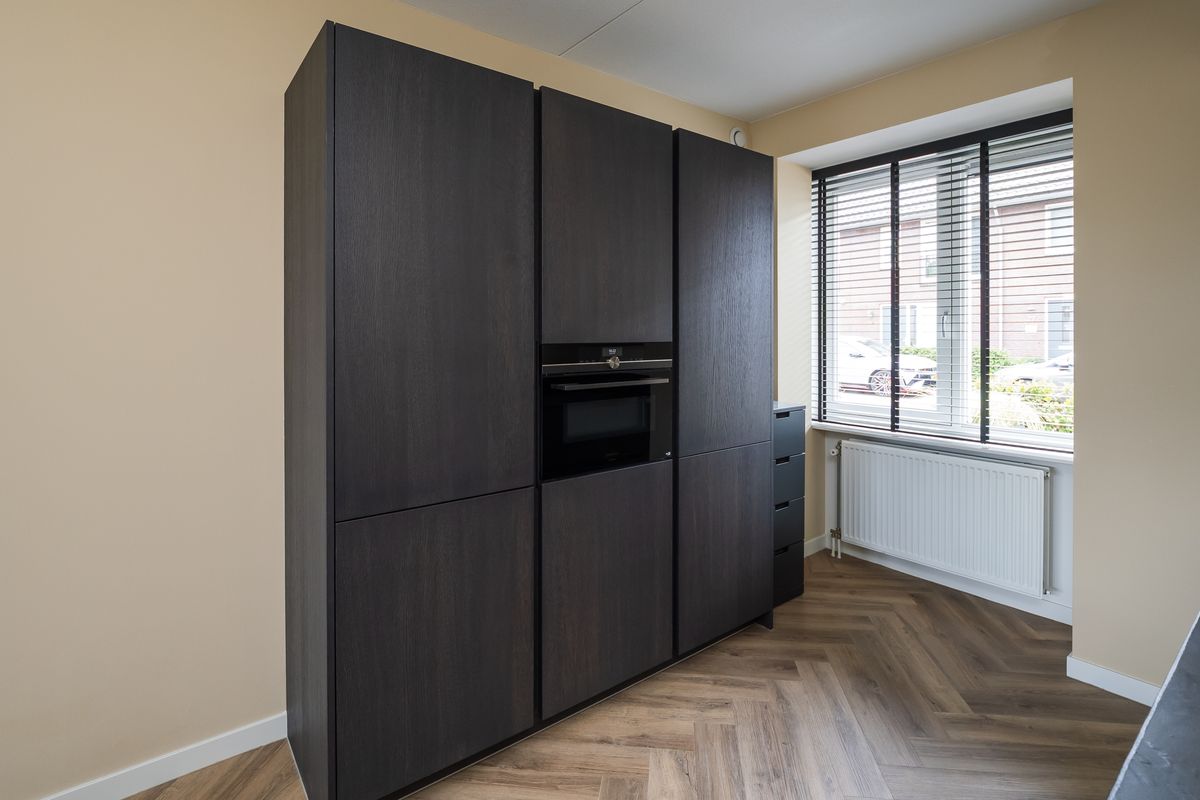 De keuken staat in open verbinding met de living en is helemaal van nu! De keukenopstelling is uitgevoerd in een donkere houtlook en bestaat uit een werkopstelling en een kastenwand. Alle inbouwapparatuur is van het kwaliteitsmerk "Siemens". De werkopstelling is uitgevoerd met een betonlook blad, inductiekookplaat, vaatwasser en diverse laden en kastruimten. De spoelbak met Quooker" kraan in de kleur zwart zorgt ervoor dat je direct over kokend water kunt beschikken. In de koof tegen het plafond bevinden zich de inbouwspots en de op afstand bedienbare afzuigschouw. Aan de tegenoverliggende wand staat de hoge kastenwand, waarin naast veel kastruimte ook de combimagnetron, de koelkast en de vrieskast (met drie laden) zijn geïntegreerd. De erker in de voorgevel biedt een leuk uitzicht op het vriendelijke straatbeeld van de Buitenhof. Kortom, een fijne plek om uitgebreid te koken.