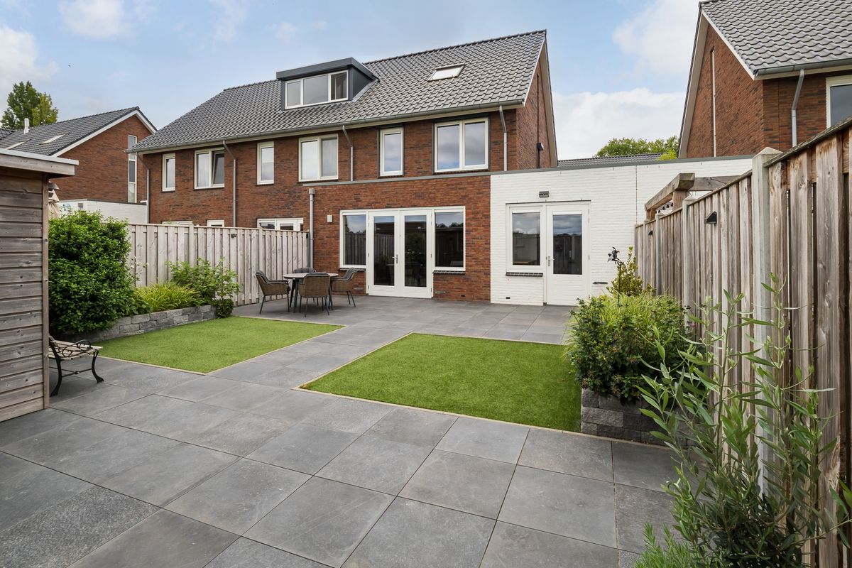De heerlijke loungetuin nodigt uit om buiten te leven. De strakke en moderne inrichting bestaat uit grote keramische tegels, die een royaal terras vormen tegen de achtergevel en een pad dat leidt naar een tweede terras achterin de tuin. Zo vind je op zomerse dagen altijd een zonnige of juist beschutte plek om te ontspannen. Verhoogde plantenbakken en borders met kunstgras zorgen voor een frisgroen accent. Praktische extra’s zoals de tuinberging en de solide erfafscheiding van betonnen palen met houten schermen bieden zowel gemak als optimale privacy. Ook ’s avonds is het hier goed vertoeven: de solar lichtpunten creëren een sfeervolle ambiance. Een extra brede houten poort in de erfafscheiding geeft toegang tot het burenpad, zodat je de openbare weg kunt bereiken.