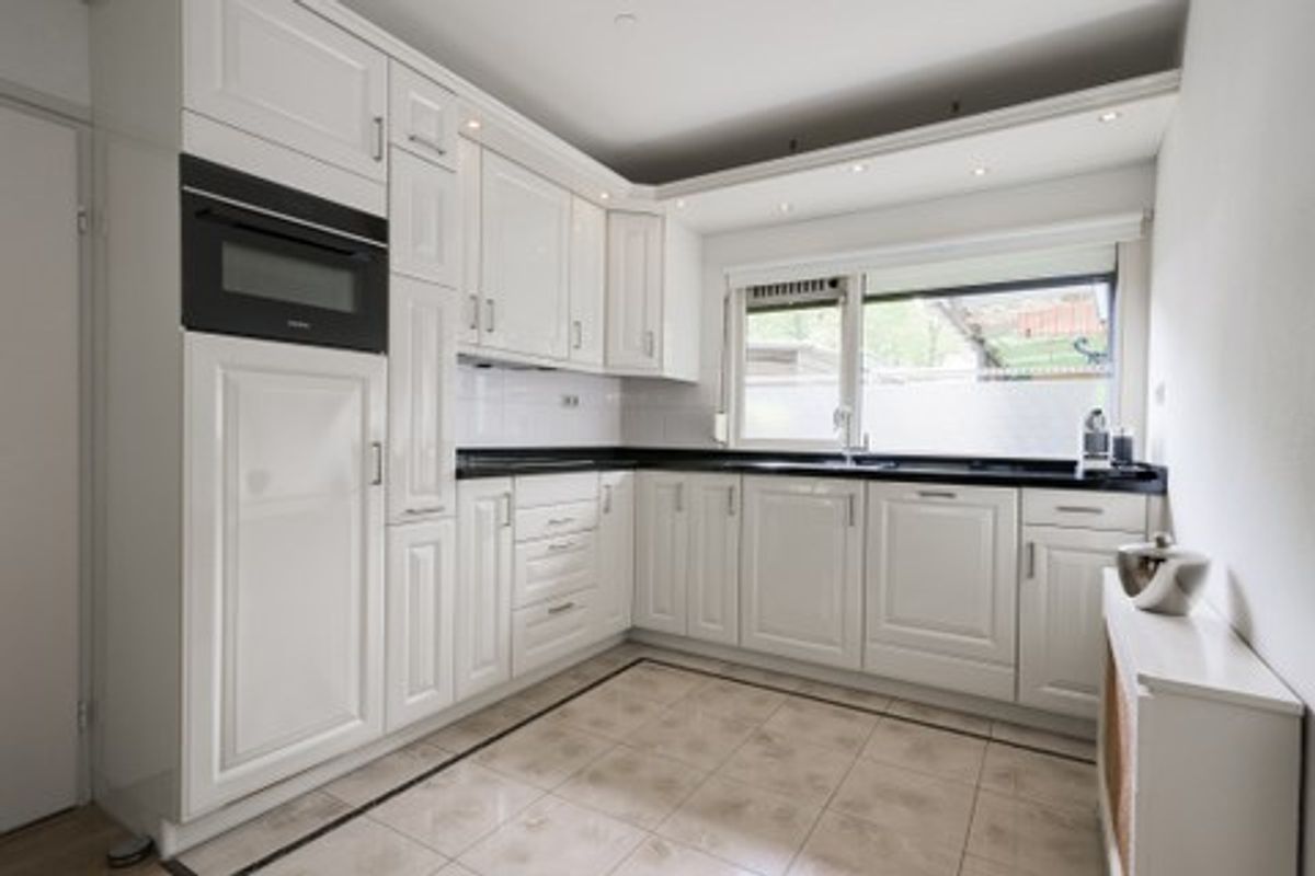 De witte keuken is voorzien van een luxe granieten werkblad dat niet alleen praktisch is maar ook een stijlvolle uitstraling heeft. De complete inrichting met inductiekookplaat, koelkast, afzuigkap, vaatwasser en oven maakt koken tot een plezier. De keuken staat in open verbinding met de eethoek, waardoor u tijdens het koken gemakkelijk contact houdt met uw gasten. Het grote raam zorgt voor een prettige werkplek met veel daglicht.