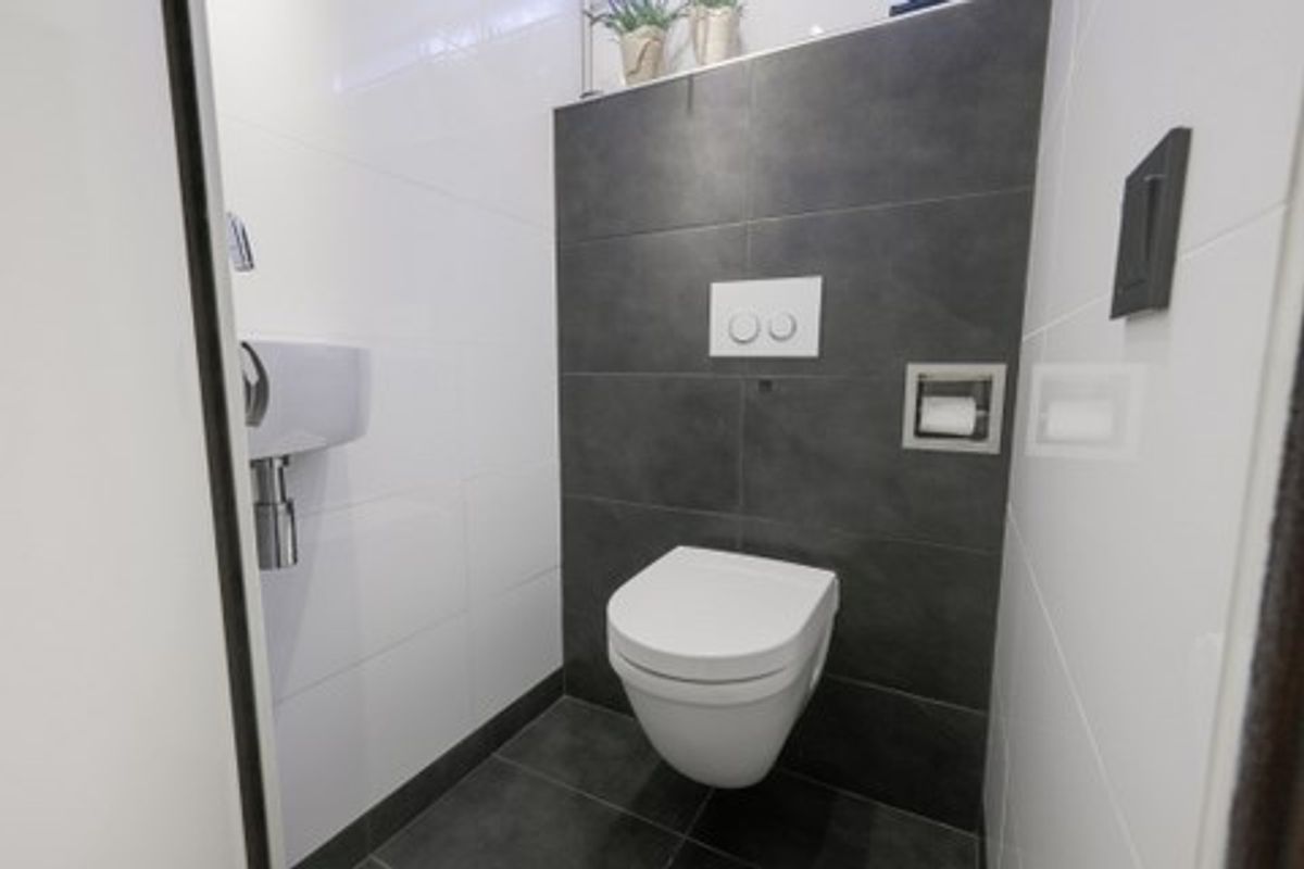 De lichte badkamer is volledig betegeld in wit met een decoratieve rand. U vindt hier een douchecabine, toilet, wastafel met meubel en de witgoedaansluiting. Het grote raam zorgt voor natuurlijke ventilatie en maakt de ruimte extra aangenaam. De vele kastruimte biedt volop opbergmogelijkheden.