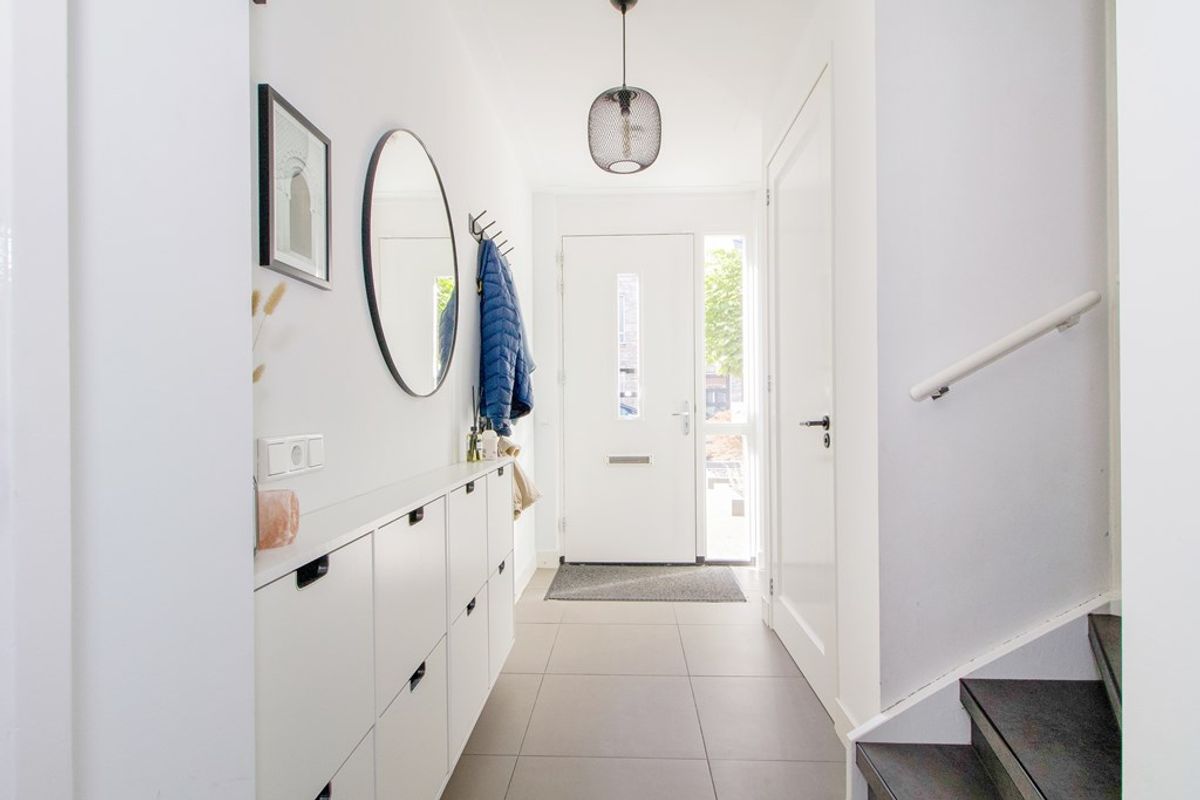 Aan de achterzijde bevindt zich de royale woonkamer, die dankzij de grote raampartijen en openslaande deuren naar de tuin een heerlijk lichte leefruimte vormt. De woonkamer strekt zich uit over de volle breedte van de woning en biedt volop indelingsmogelijkheden voor zowel een zit- als eetgedeelte. Daarnaast is er een praktische trapkast aanwezig voor extra bergruimte.