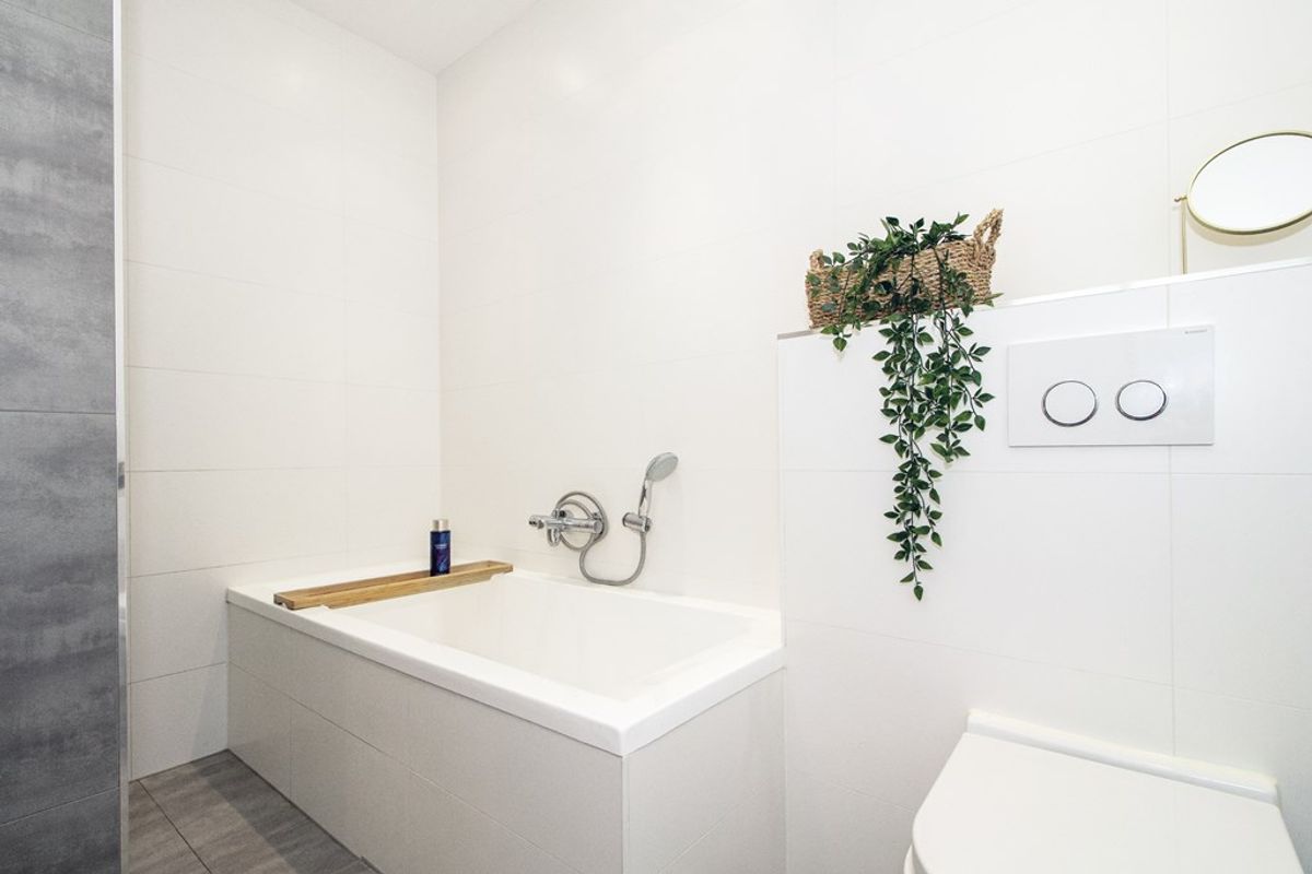 De badkamer is centraal gesitueerd en uitgerust met een ligbad, wastafel en toilet. Een praktische indeling met alle benodigde voorzieningen binnen handbereik.