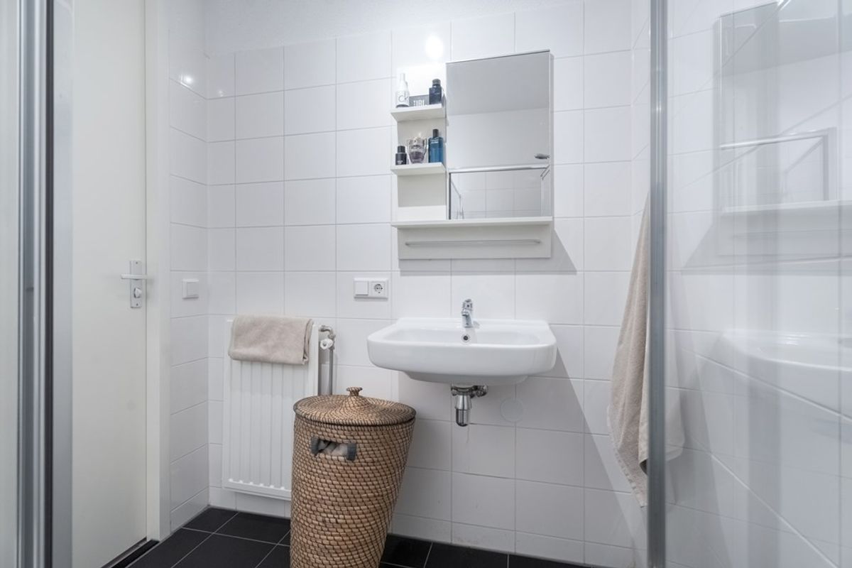 Aan de rechterzijde bevindt zich de badkamer, voorzien van een toilet, wastafel en douche. Daarnaast ligt de slaapkamer — een prettig ingedeelde ruimte met voldoende plaats voor een tweepersoonsbed en kastruimte. Dankzij het grote raam komt hier veel daglicht binnen, wat zorgt voor een aangename sfeer.