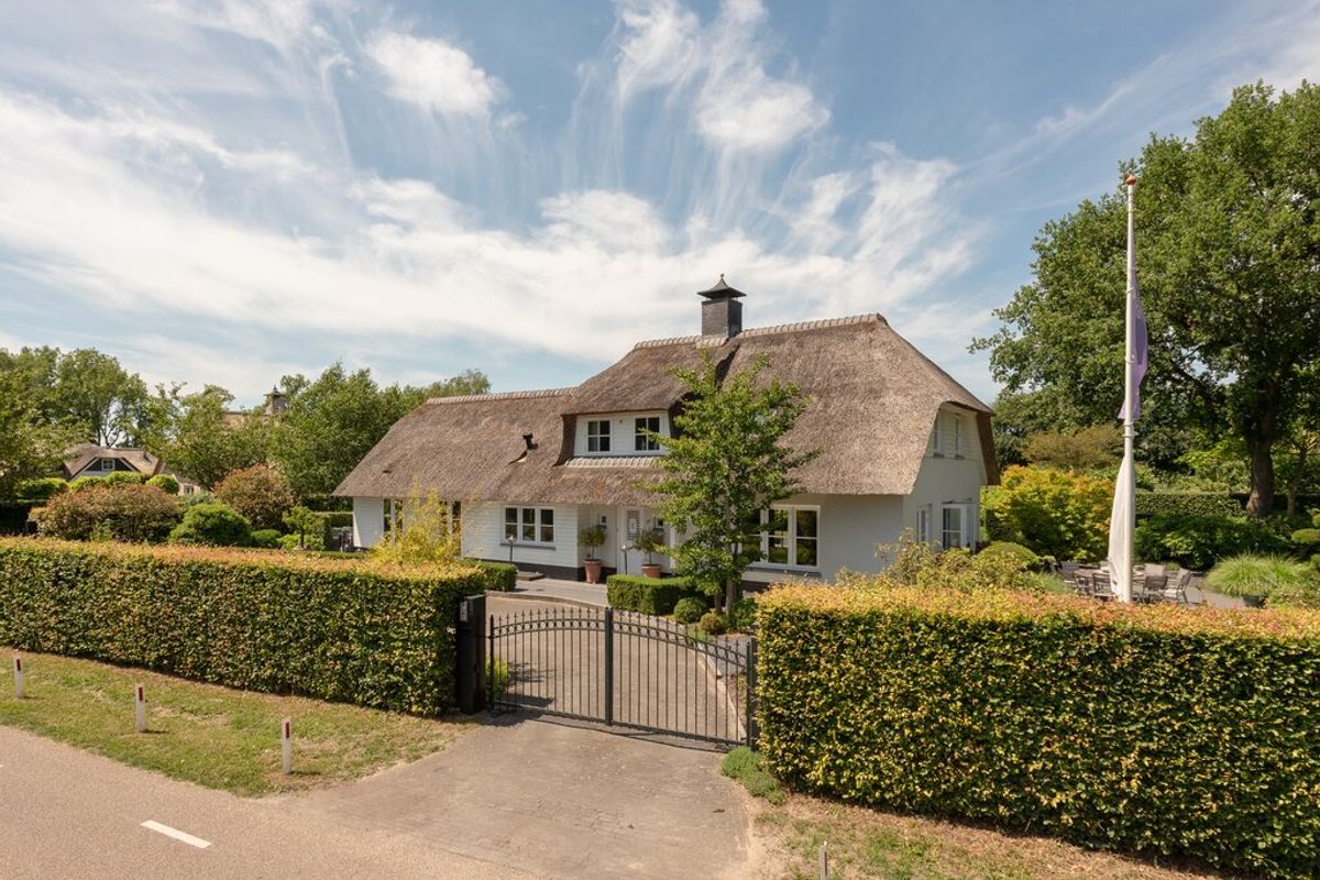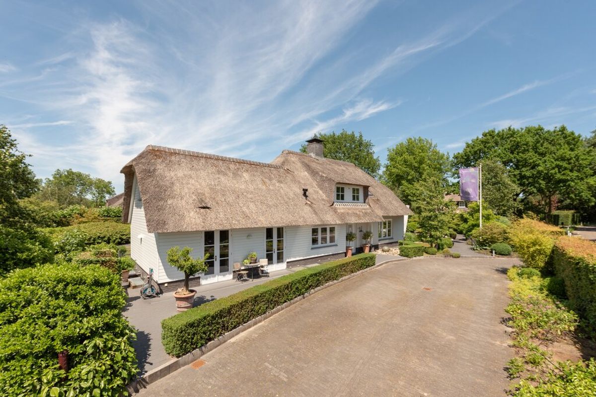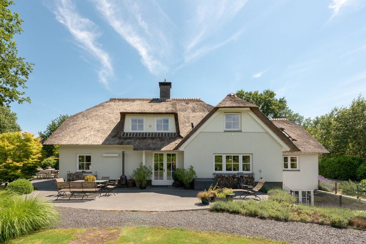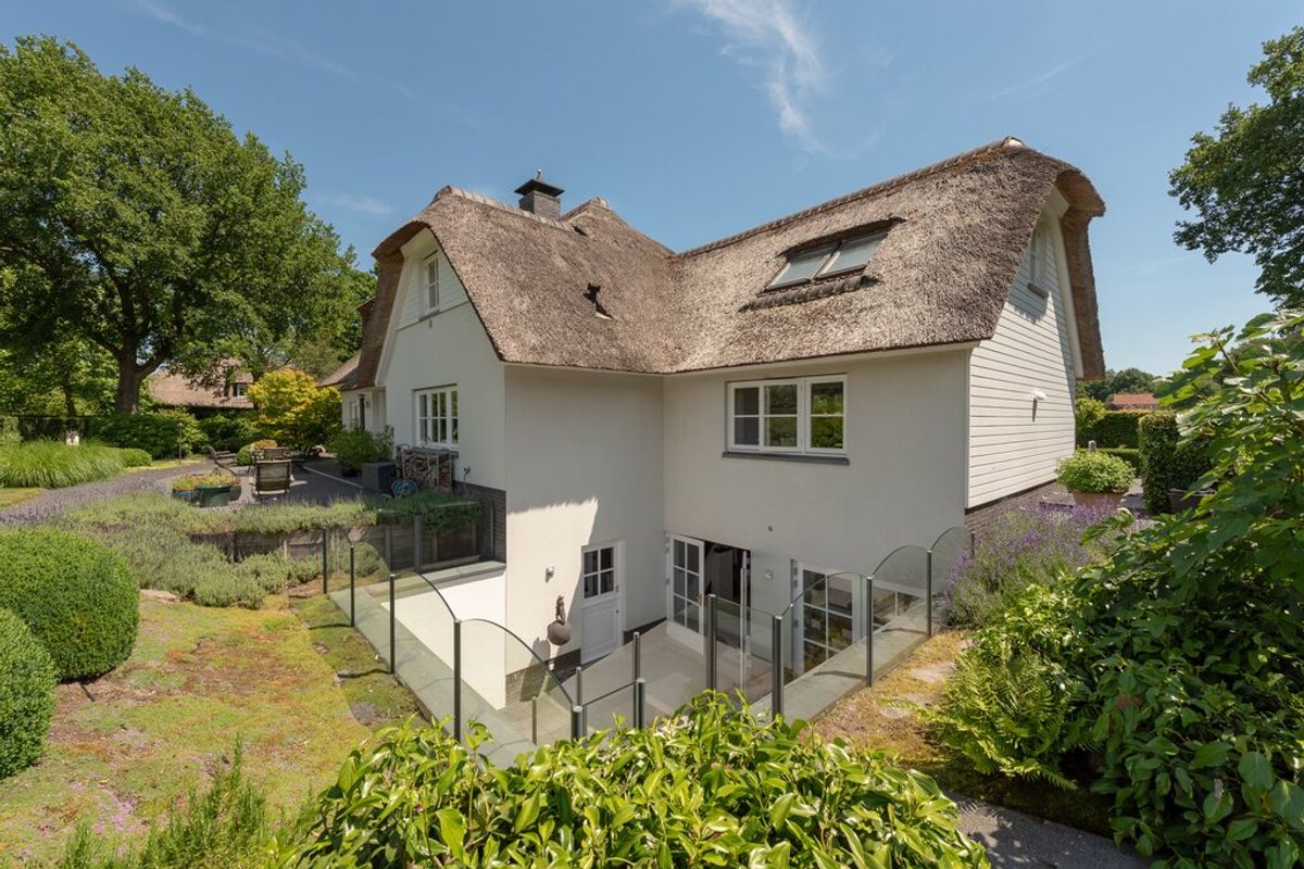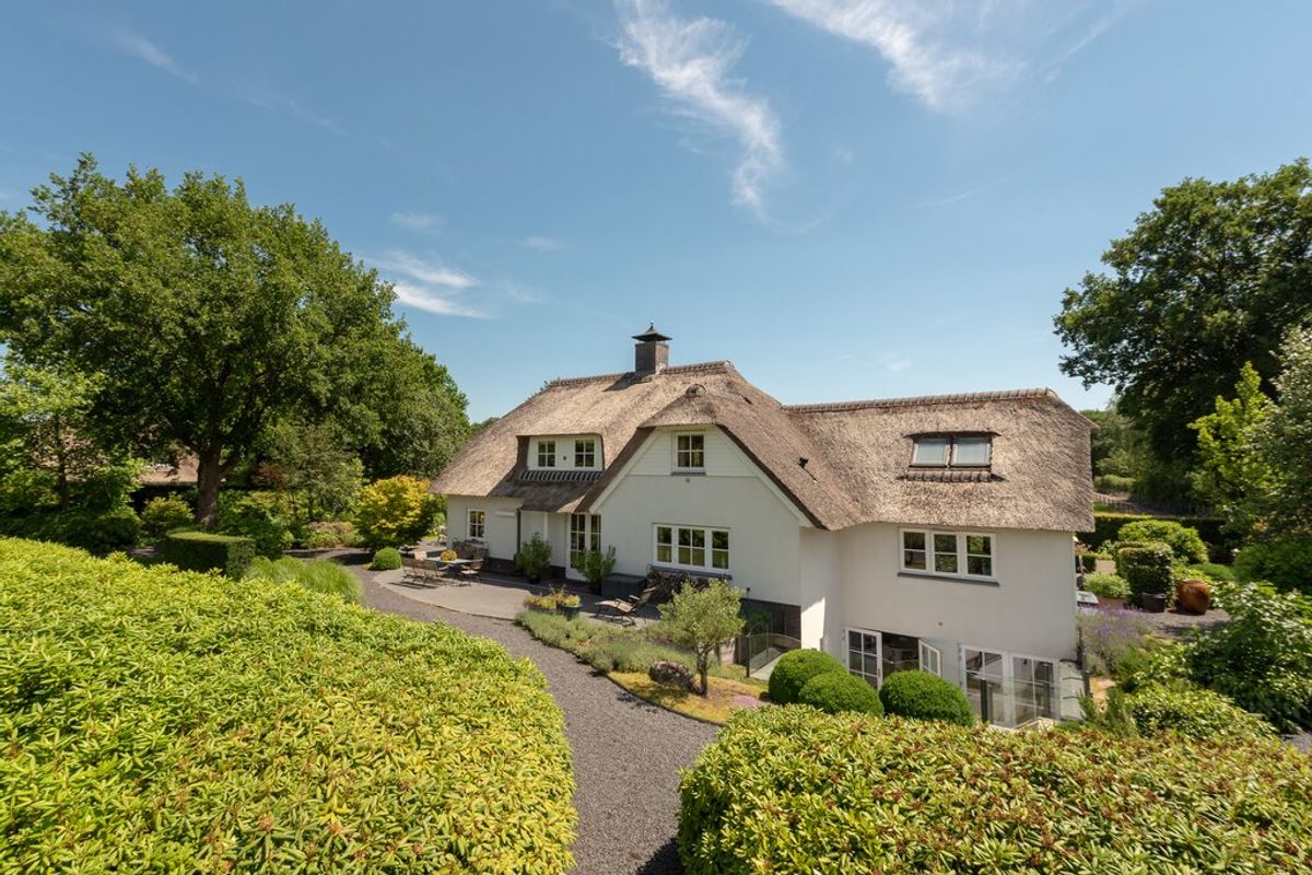De traditionele bouwstijl van de villa is volledig in harmonie met de omgeving. De rieten kap, wit gestucte en gedeeltelijk gepotdekselde gevels, vensters met roedeverdeling, hardstenen raamdorpels en een kloeke schoorsteen met smeedijzeren kap dragen bij aan de charmante landhuisstijl. De hal bevindt zich centraal in de woning, met een twee verdiepingen hoog plafond, trapopgang, garderobe en gastentoilet. De toegang naar het woongedeelte rechts met een open haard met zandstenen schouw en drie stel openslaande deuren naar het terras en de tuin. De eetkamer verbindt de woonkamer en de bibliotheekruimte. Zowel de eetkamer als de bibliotheek zijn voorzien van openslaande deuren. De lichte Eggersmann keuken is strak en tijdloos en afgewerkt met een prachtig werkblad in graniet (Labrador) en alle denkbare inbouwapparatuur. Op de begane grond is gekozen voor een tijdloze vloer in Portugese Estremoz marmer, uiteraard voorzien van vloerverwarming.