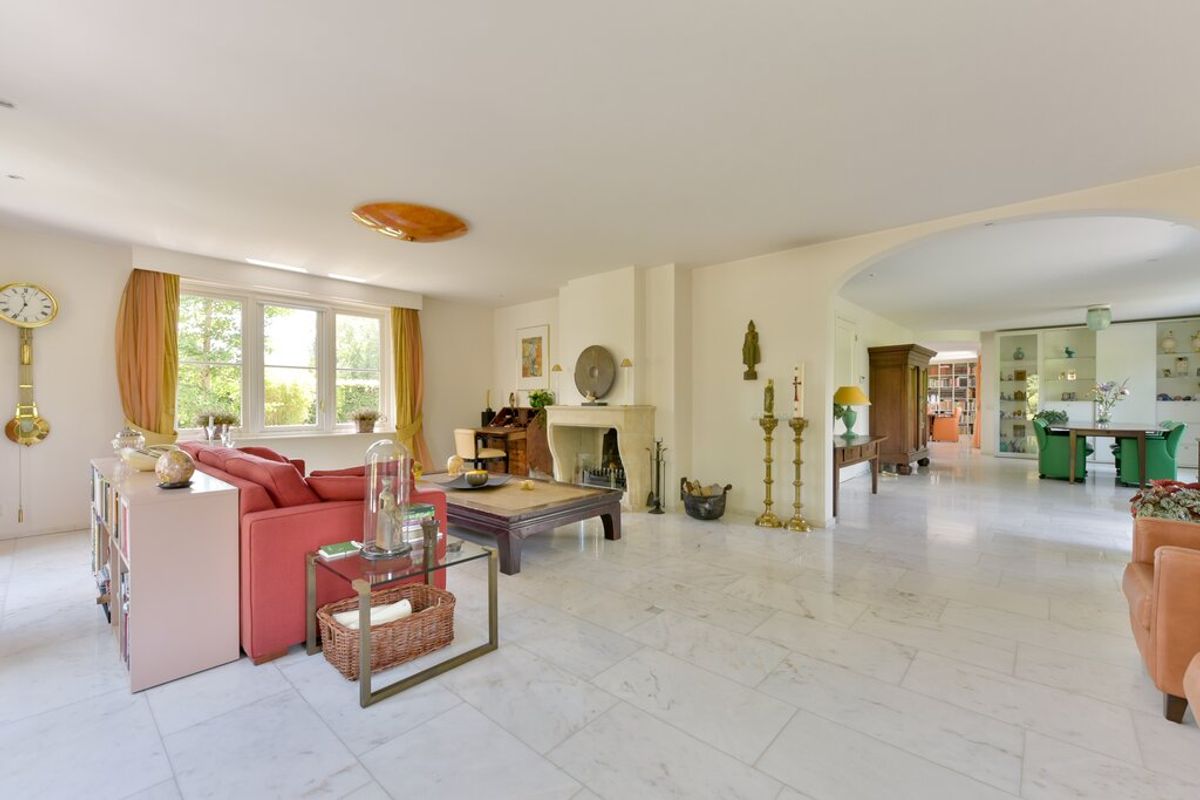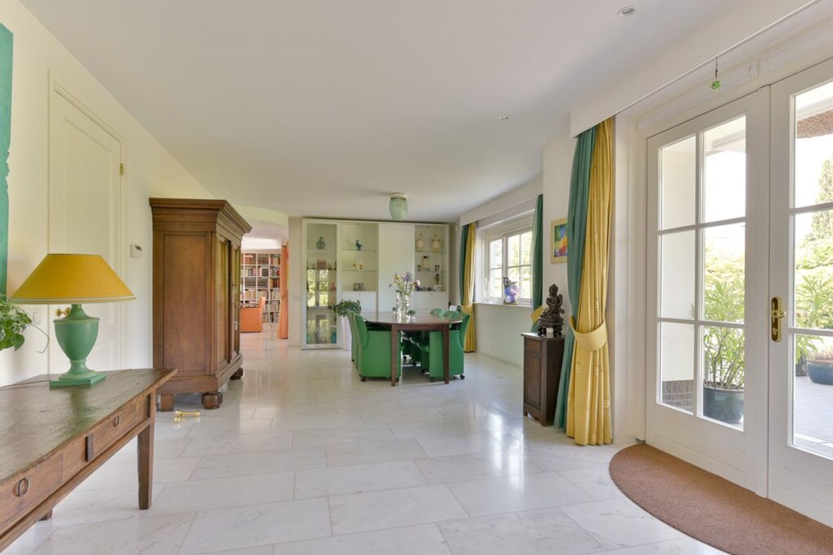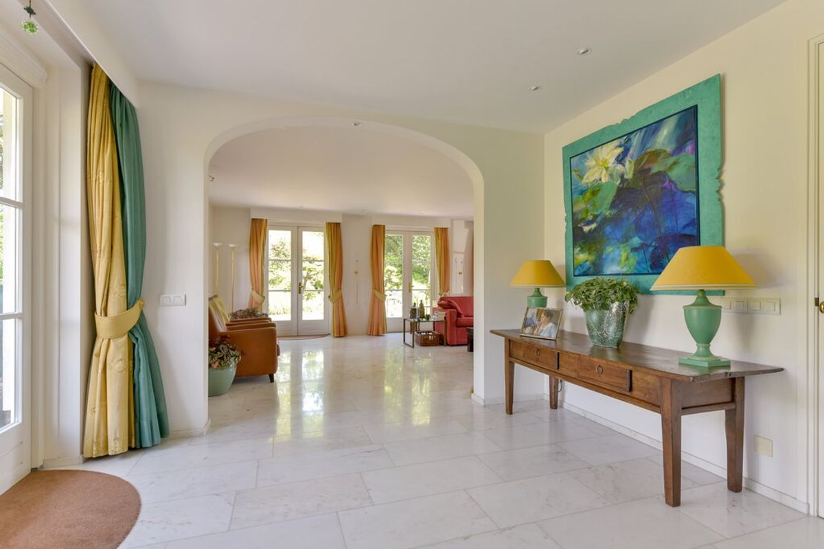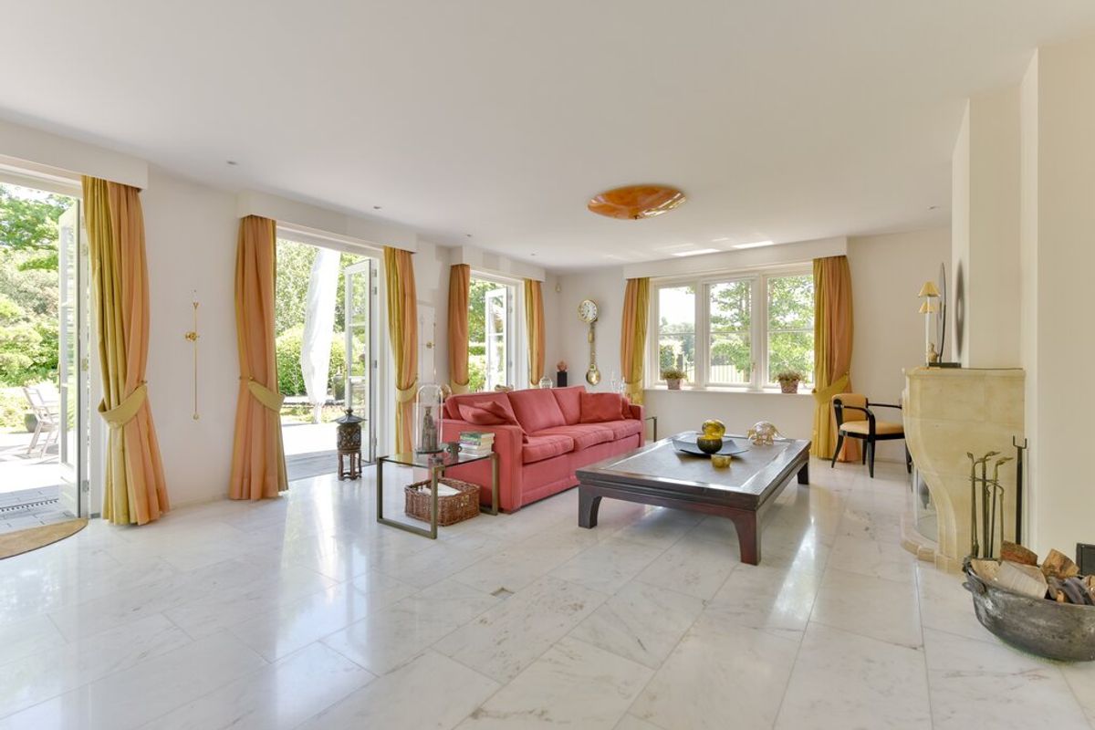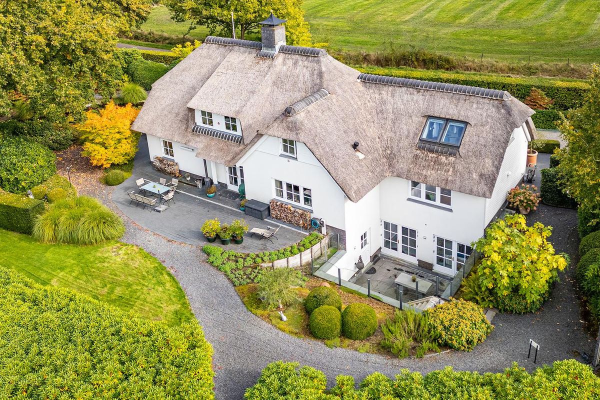 De traditionele bouwstijl van de villa is volledig in harmonie met de omgeving. De rieten kap, wit gestucte en gedeeltelijk gepotdekselde gevels, vensters met roedeverdeling, hardstenen raamdorpels en een kloeke schoorsteen met smeedijzeren kap dragen bij aan de charmante landhuisstijl. De hal bevindt zich centraal in de woning, met een twee verdiepingen hoog plafond, trapopgang, garderobe en gastentoilet. De toegang naar het woongedeelte rechts met een open haard met zandstenen schouw en drie stel openslaande deuren naar het terras en de tuin. De eetkamer verbindt de woonkamer en de bibliotheekruimte. Zowel de eetkamer als de bibliotheek zijn voorzien van openslaande deuren. De lichte Eggersmann keuken is strak en tijdloos en afgewerkt met een prachtig werkblad in graniet (Labrador) en alle denkbare inbouwapparatuur. Op de begane grond is gekozen voor een tijdloze vloer in Portugese Estremoz marmer, uiteraard voorzien van vloerverwarming.