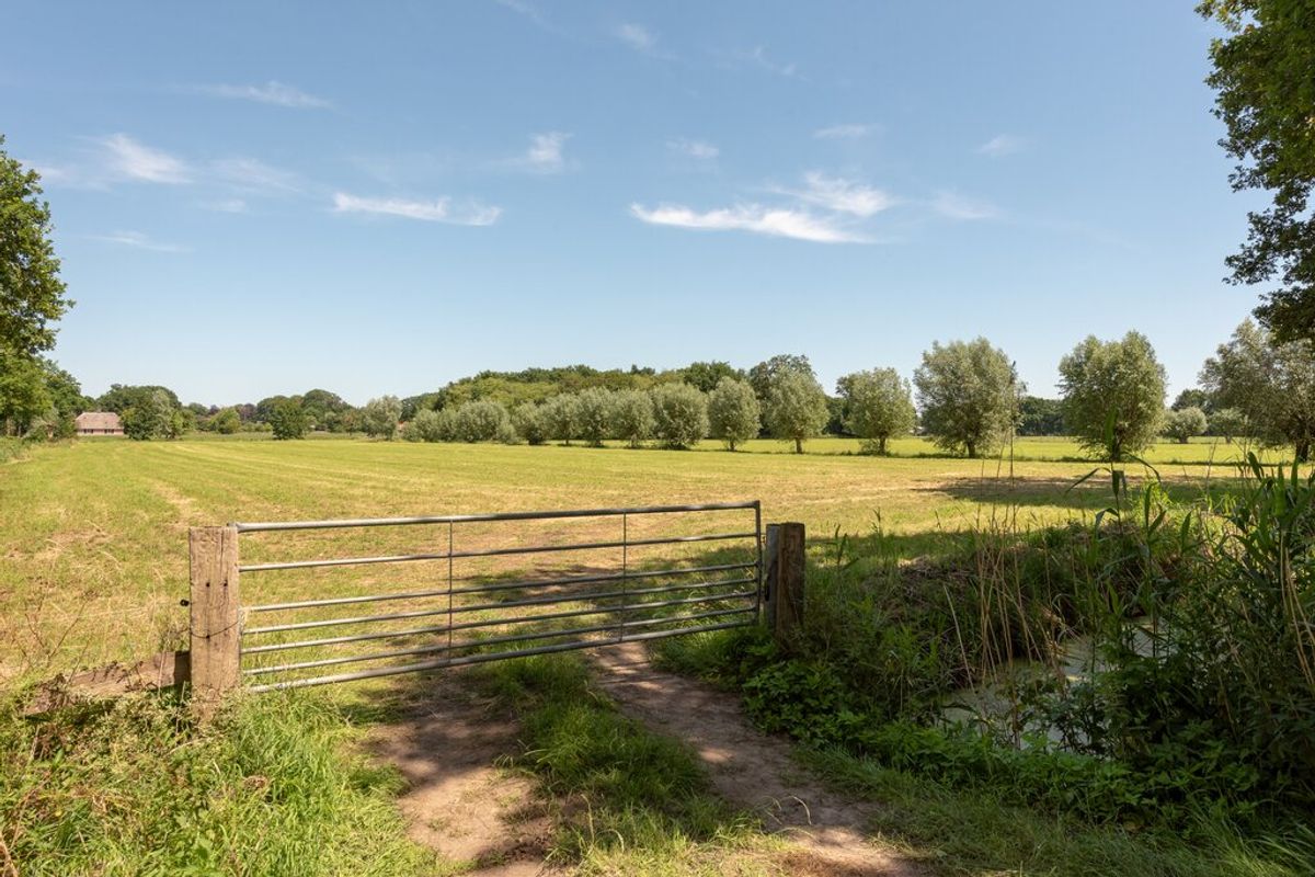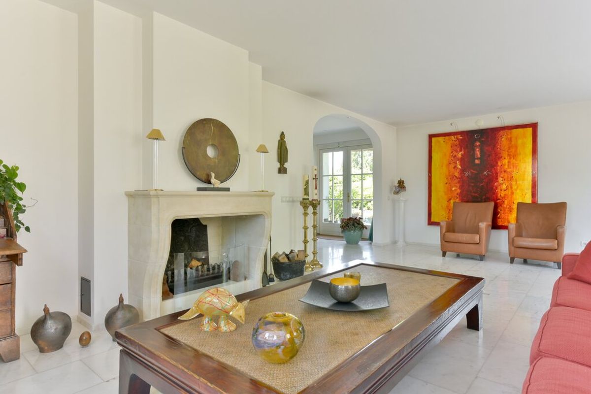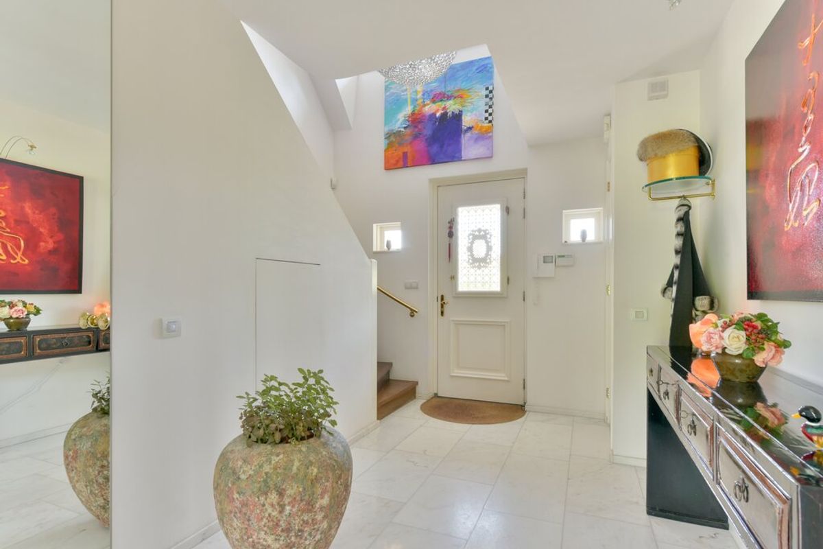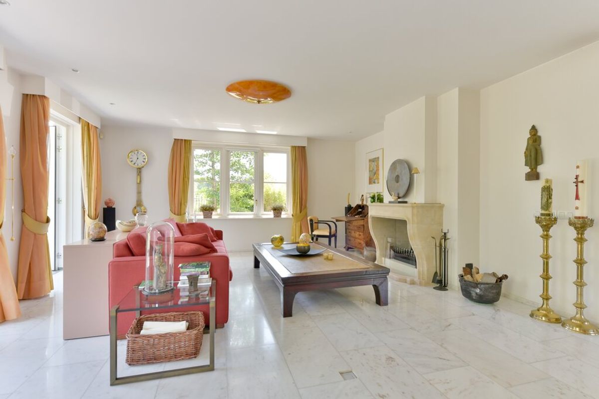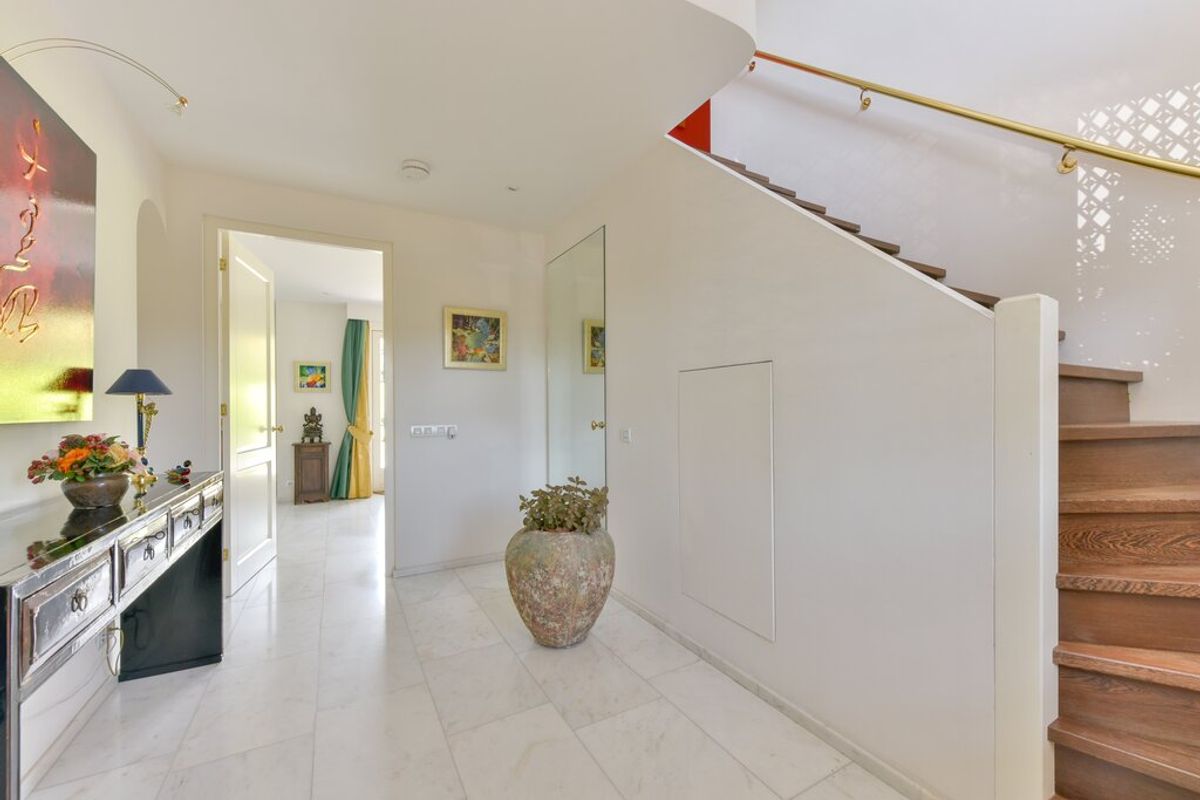 De traditionele bouwstijl van de villa is volledig in harmonie met de omgeving. De rieten kap, wit gestucte en gedeeltelijk gepotdekselde gevels, vensters met roedeverdeling, hardstenen raamdorpels en een kloeke schoorsteen met smeedijzeren kap dragen bij aan de charmante landhuisstijl. De hal bevindt zich centraal in de woning, met een twee verdiepingen hoog plafond, trapopgang, garderobe en gastentoilet. De toegang naar het woongedeelte rechts met een open haard met zandstenen schouw en drie stel openslaande deuren naar het terras en de tuin. De eetkamer verbindt de woonkamer en de bibliotheekruimte. Zowel de eetkamer als de bibliotheek zijn voorzien van openslaande deuren. De lichte Eggersmann keuken is strak en tijdloos en afgewerkt met een prachtig werkblad in graniet (Labrador) en alle denkbare inbouwapparatuur. Op de begane grond is gekozen voor een tijdloze vloer in Portugese Estremoz marmer, uiteraard voorzien van vloerverwarming.