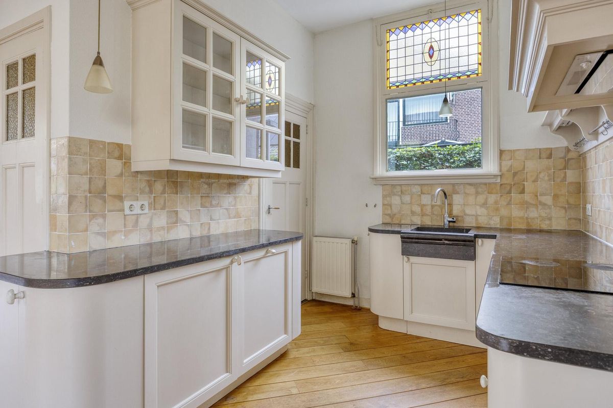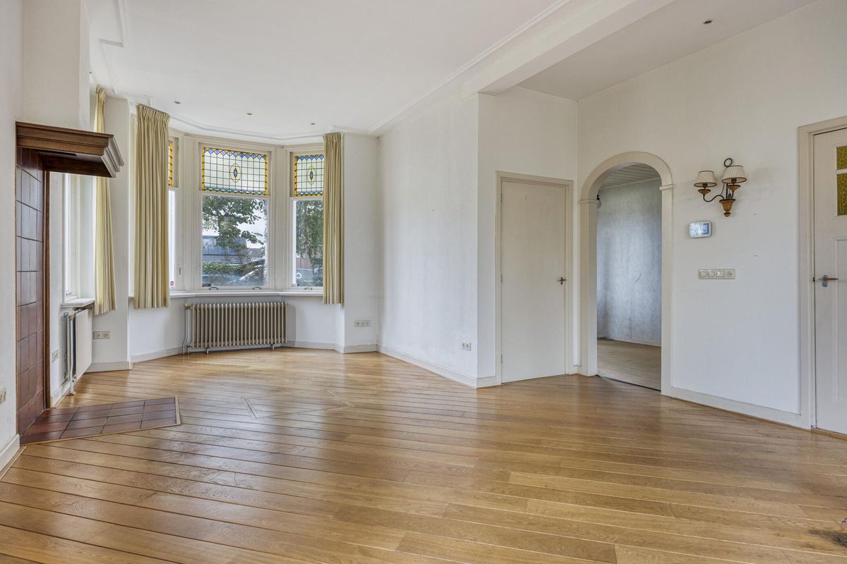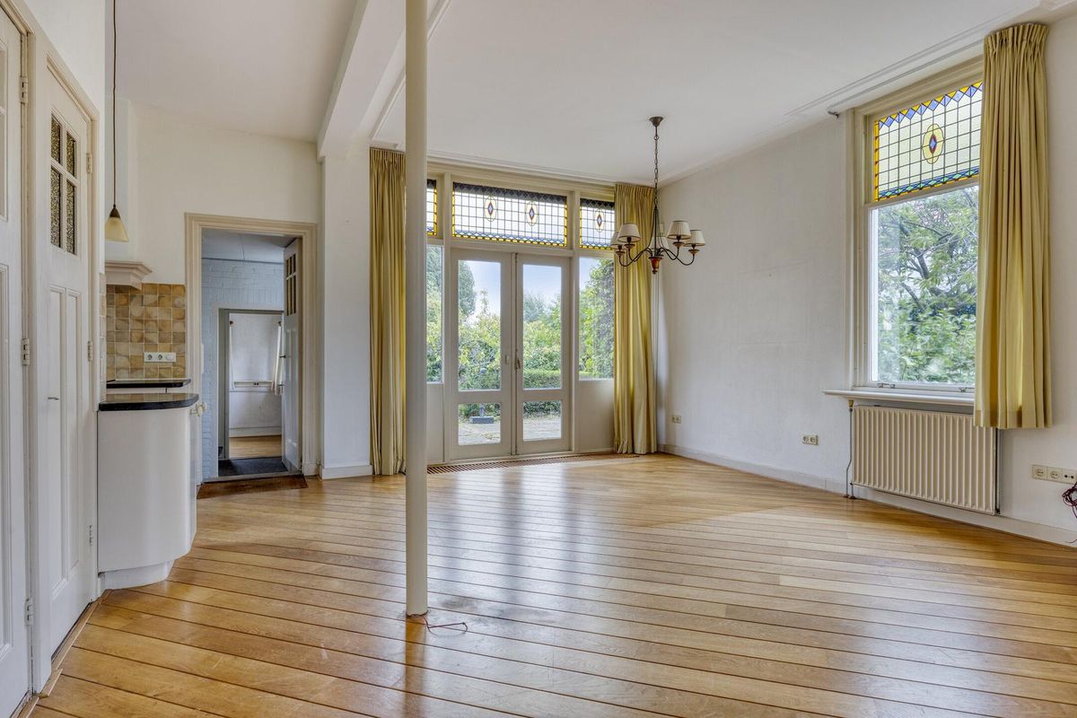 Sfeervolle lichte doorzon woonkamer (ca. 42 m2) voorzien van een lichte houten vloer, hoog plafond met sierlijsten en schitterende glas-in-loodramen. De meterkast is afgewerkt in een vaste kast. Middels openslaande deuren heeft u toegang tot de zonnige achtertuin. Via de woonkamer heeft u toegang tot de werkkamer.