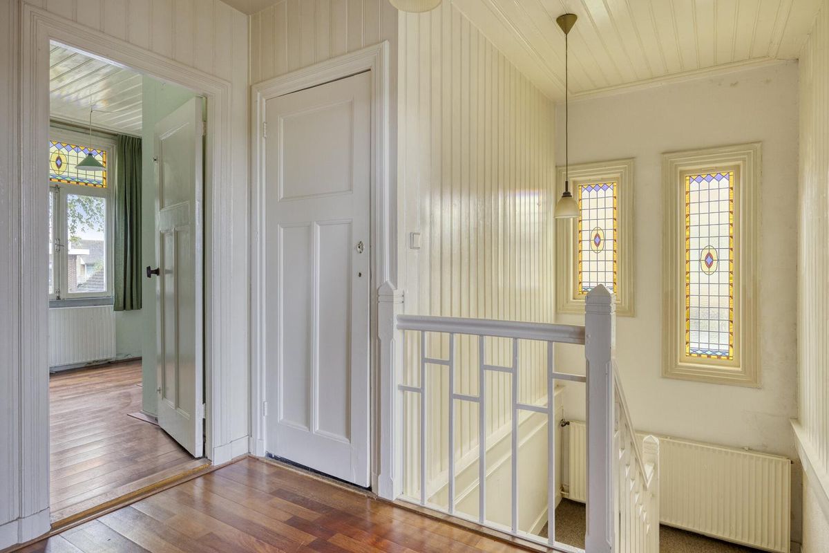 Ruime overloop met toegang tot alle vertrekken. De overloop biedt veel natuurlijke lichtinval dankzij twee mooie glas-in-lood ramen.