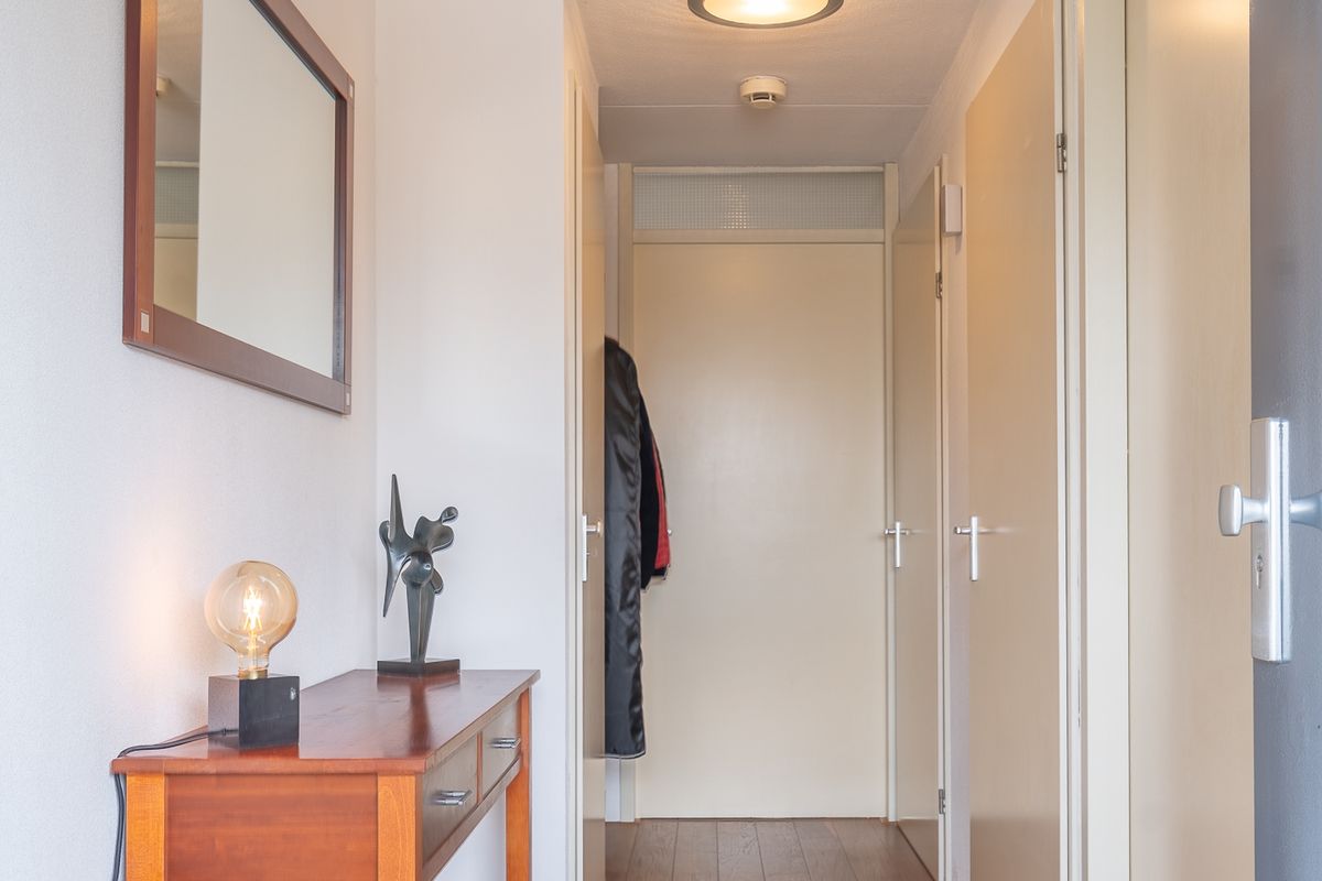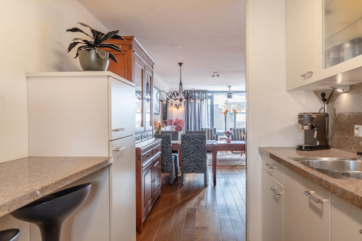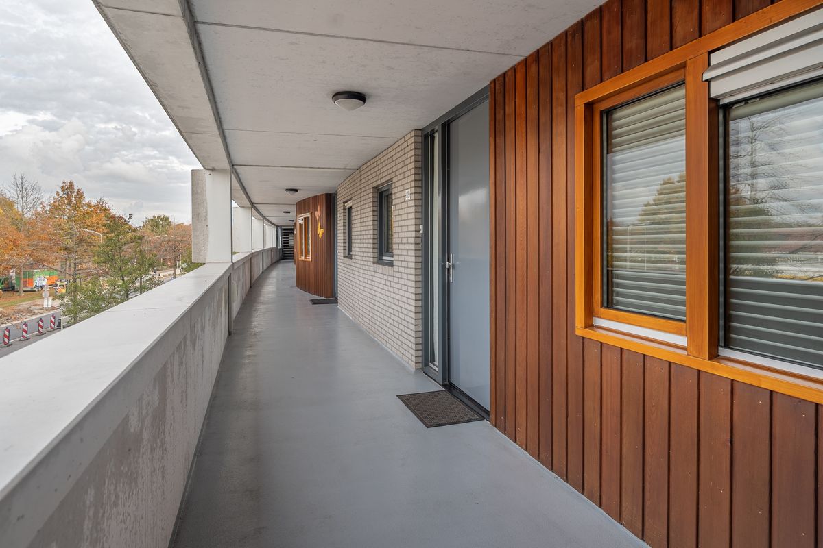 Vanuit de galerij kom je binnen in de hal die toegang biedt tot de verschillende vertrekken. De woonkamer is licht en prettig ingedeeld, met grote raampartijen en een deur naar het zonnige balkon op het zuiden. De woning is voorzien van een eiken parketvloer, wat zorgt voor een warme en stijlvolle uitstraling.