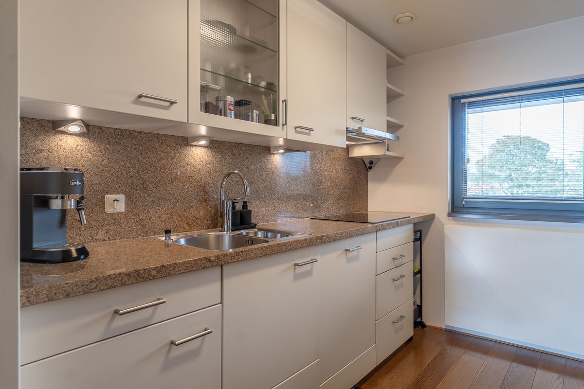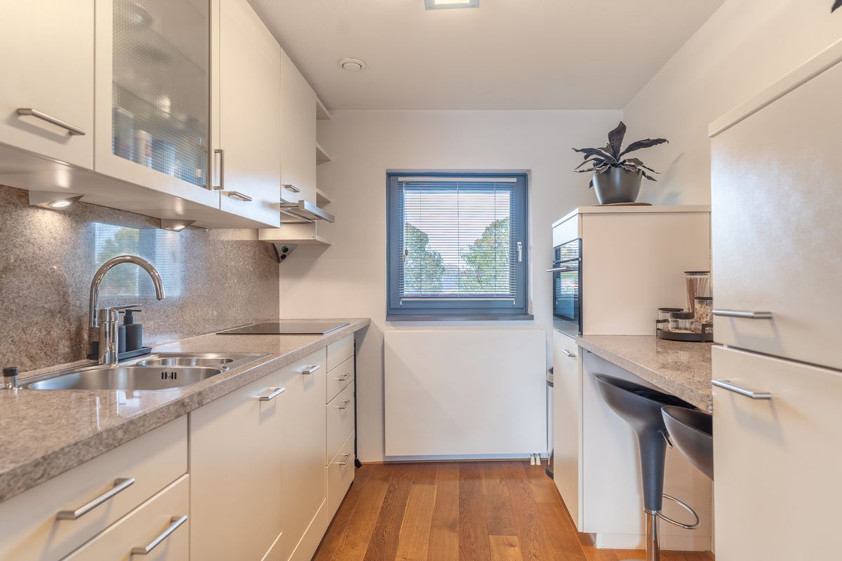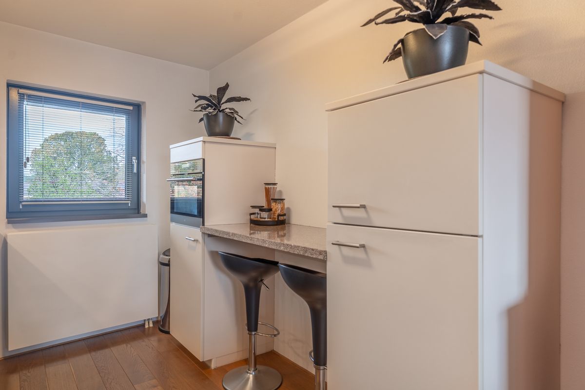 De halfopen keuken is uitgerust met moderne inbouwapparatuur, waaronder een combimagnetron, koel-vriescombinatie, vaatwasser, kookplaat en afzuigkap.