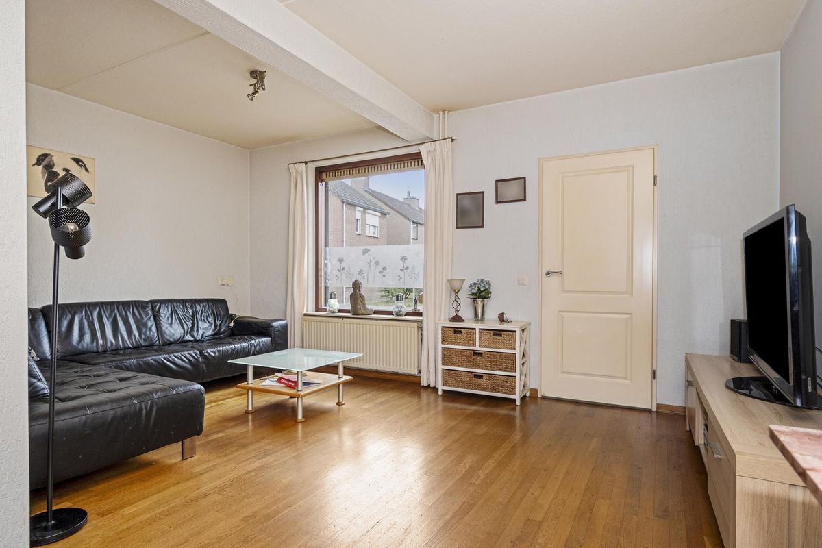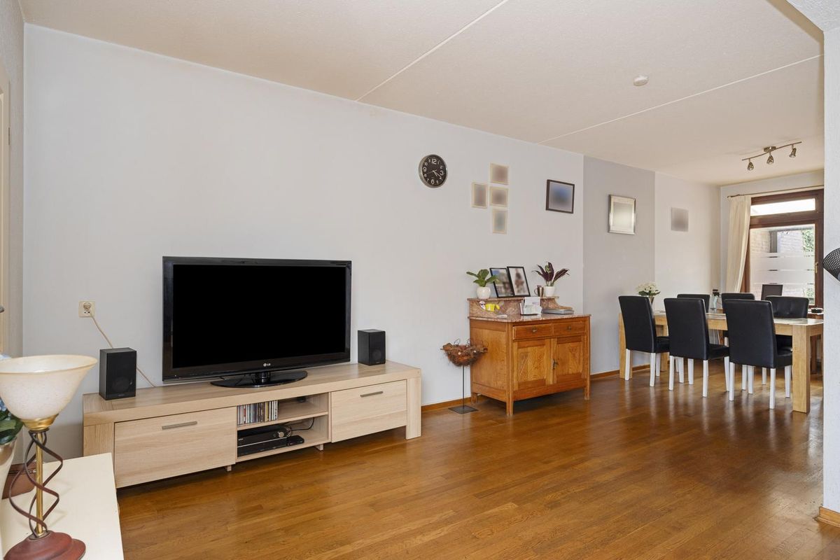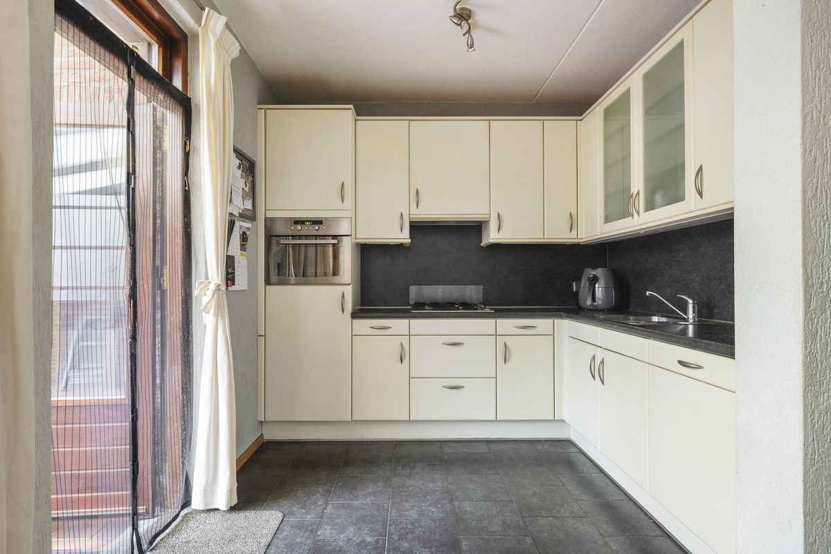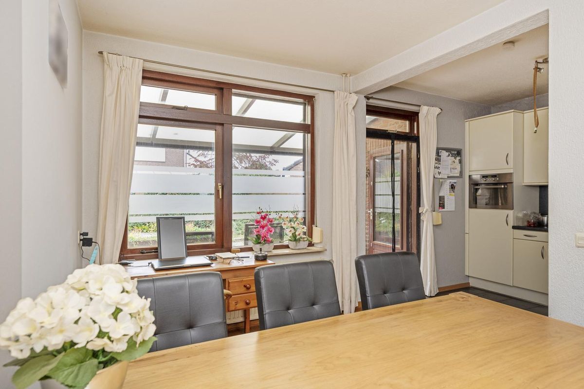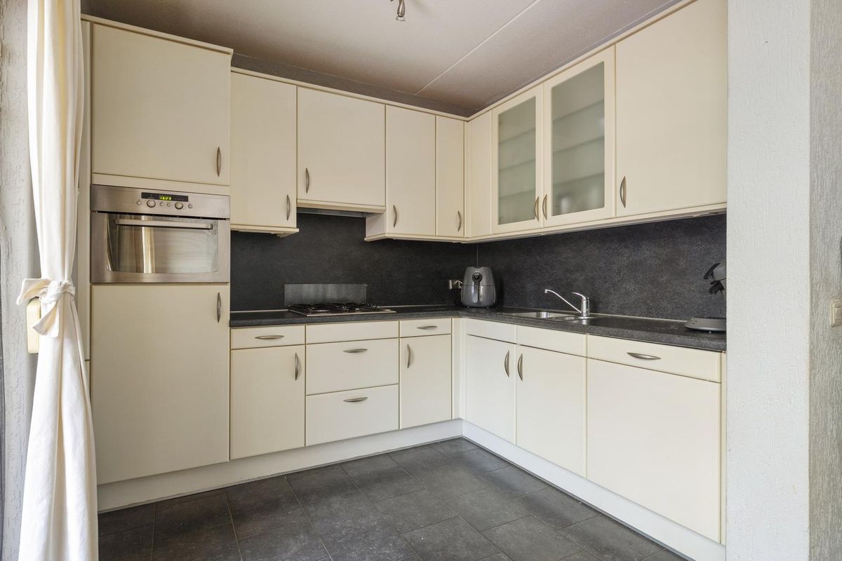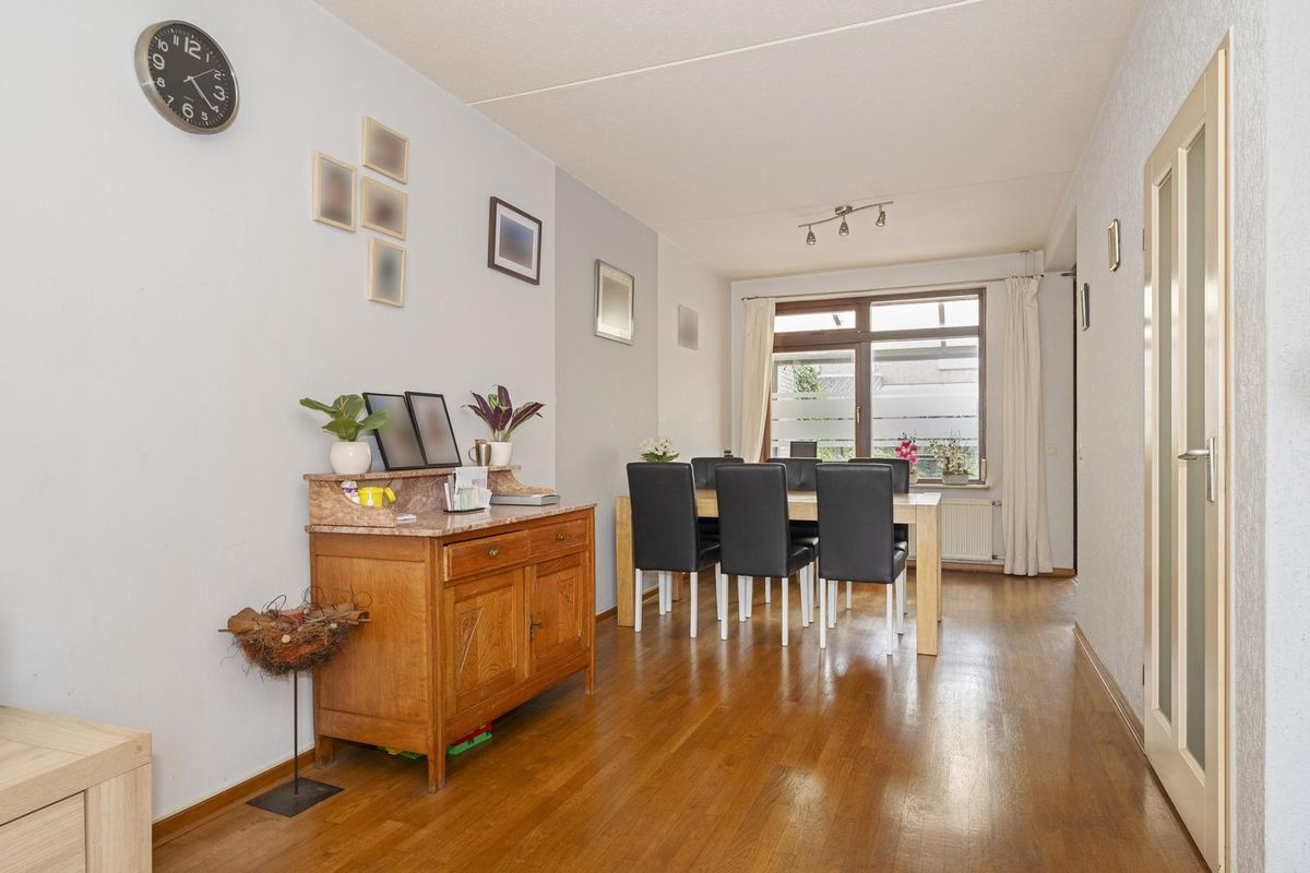 Hal/entree met mooie kunststof voordeur, meterkast, muurkast en toegang tot de living. De woonkamer en keuken staan in half open verbinding met elkaar, ingedeeld tot zitkamer aan straatzijde en keuken met eettafel aan tuinzijde. De keuken voorziet in een ruime aanbouwkeuken met veel kastruimte en de volgende apparatuur; vaatwasser, 4-pits gaskookplaat met afzuigkap, koelkast en een combi oven-magnetron. Het warme water in de keuken komt uit een close-inn boiler. Een tussenportaal geeft toegang tot het ruime toilet en de trap naar de eerste etage. Grenzend aan de keuken is er een overdekt terras te bereiken met toegang tot bijkeuken en garage. In de bijkeuken zijn de wasautomaten geplaatst en de garage is voorzien van een vliering, elektrisch bedienbare sectionaalpoort en water. De tuin van de woning is gelegen traditioneel achter de woning maar ook aan de zij kant naast de garage. Deze ruimte is ideaal voor speelplek voor kinderen of het stallen van een aanhanger.