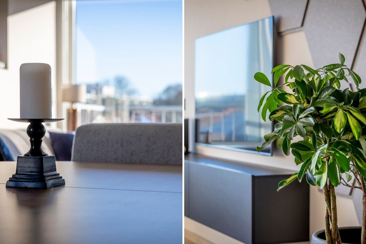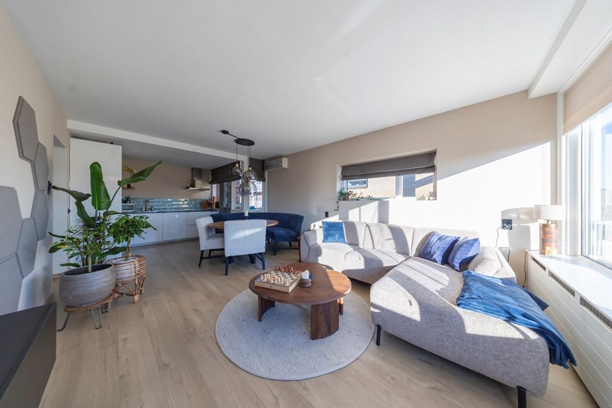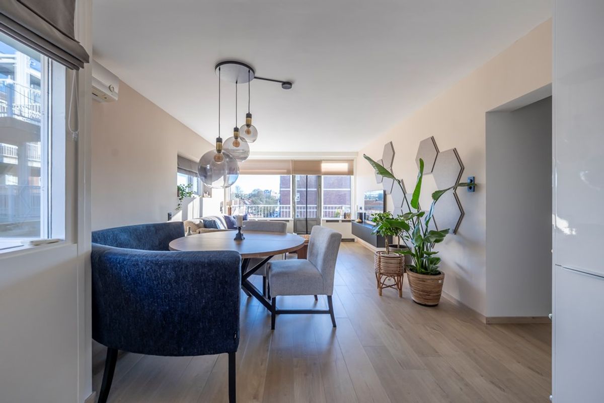 Entree in de hal met garderoberuimte, meterkast en de technische ruimte met bergmogelijkheden, de witgoedaansluitingen en de cv-ketel (2020). De tussenhal staat in directe verbinding met de keurige toiletruimte voorzien van een zwevend toilet, de badkamer, de slaapkamers en de woonkamer. Deze royale woonkamer is uitgerust met airconditioning en profiteert van veel licht dankzij de grote raampartijen en de zuidelijke ligging. Het zitgedeelte ligt bij het zonnige, zuidgerichte balkon (ca. 7 m²) met vlondervloer. De moderne open keuken (2018) in L-opstelling is compleet uitgerust met een vaatwasser, een keramische kookplaat met rvs-afzuigkap, een koelkast, een vriezer en een combi-oven. Hier is ruimte voor een eethoek en vindt de toegang plaats tot het tweede (inpandige) balkon. Beide slaapkamers bevinden zich aan de straatzijde en zijn voorzien van kunststof kozijnen met dubbele beglazing. De keurige en moderne badkamer (eveneens geplaatst in 2018) is uitgerust met een inloopdouche met regendouche en thermostaatkraan, een wastafel met bijpassend meubel en een designradiator.