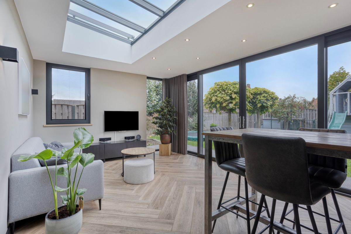 De L-vormige woonkamer (ca. 39 m²) heeft veel lichtinval en is voorzien van een airco. Stijlvolle staallook deuren geven toegang tot de tuinkamer. Deze tuinkamer (ca. 22 m²) fungeert als een fijne verlenging van de woonkamer met een warme en uitnodigende sfeer het hele jaar door. De schuifpuien naar de tuin bieden een perfecte combinatie van het binnen- en buitenleven. De tuinkamer is voorzien van een lichtstraat en screens aan de buitenzijde.