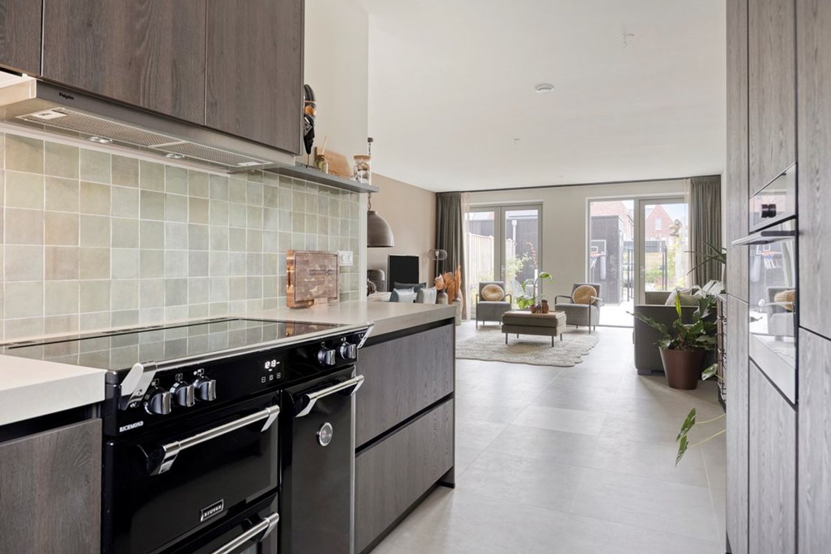…. is de Grando-keuken aan de voor/straatzijde van de woning. Stoere donkereiken, greeploze kasten en laden. Composiet werkblad met een warmgrijze betonlook. En op de wand een gemêleerd zachtgroen hoogglans keramisch tegeltje. Erg mooie combi. Inbouw(Pelgrim)apparatuur: vijfpits inductiekookplaat, Richmond oven (3 stuks!), afzuigkap, koelkast XXL, vriezer, vaatwasser en een combi oven-magnetron.