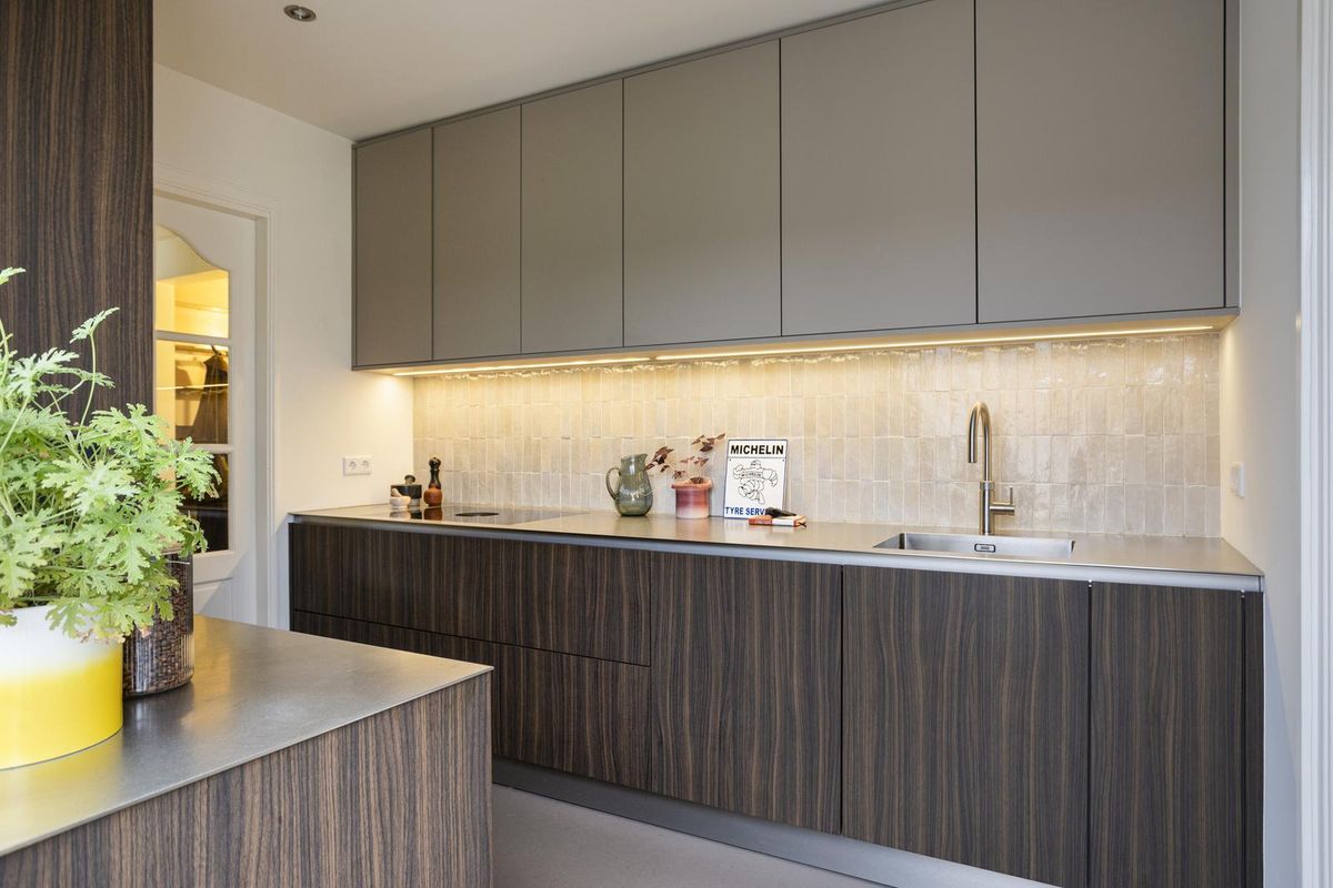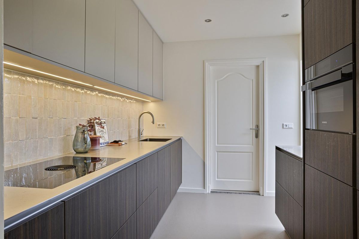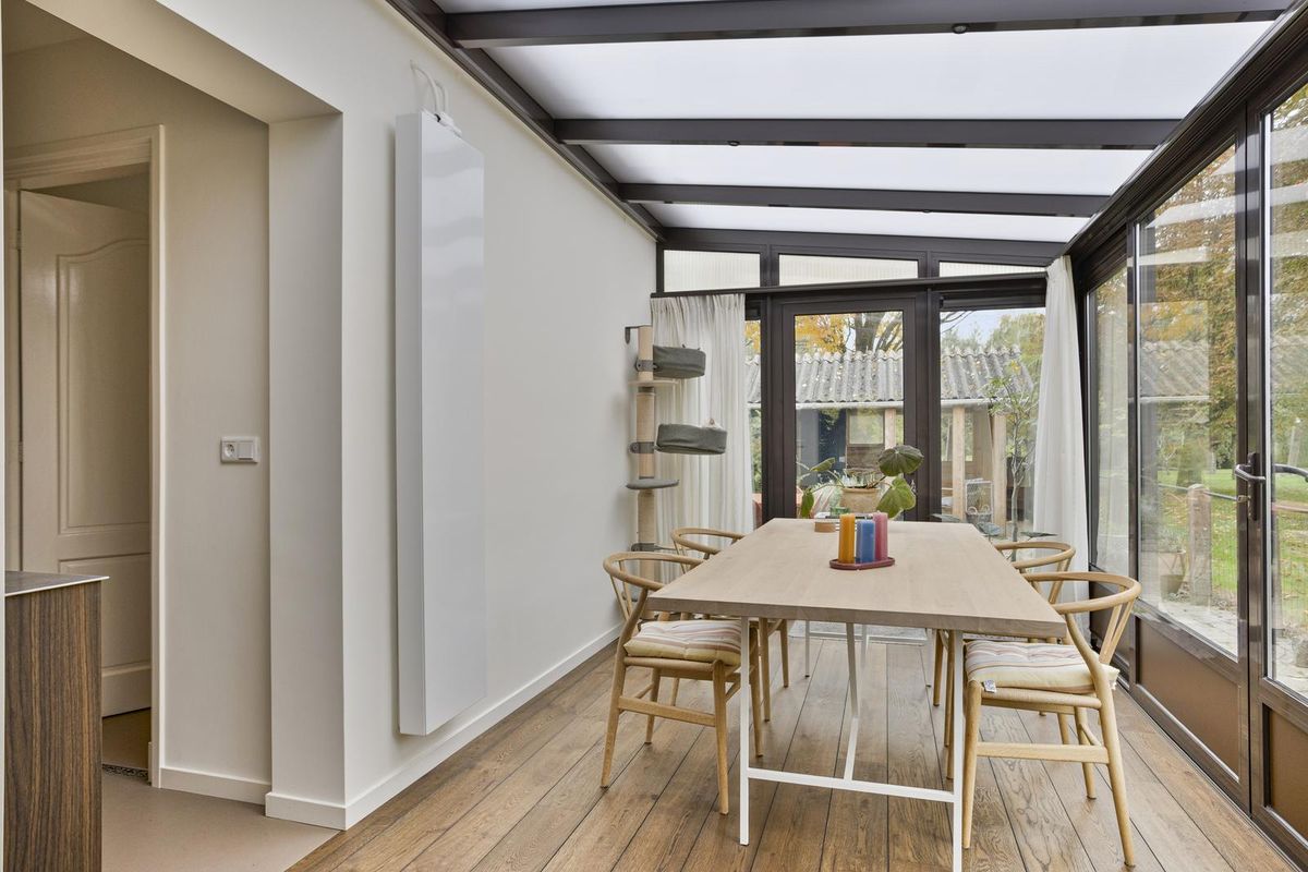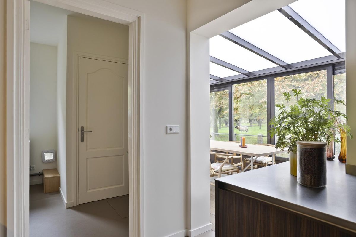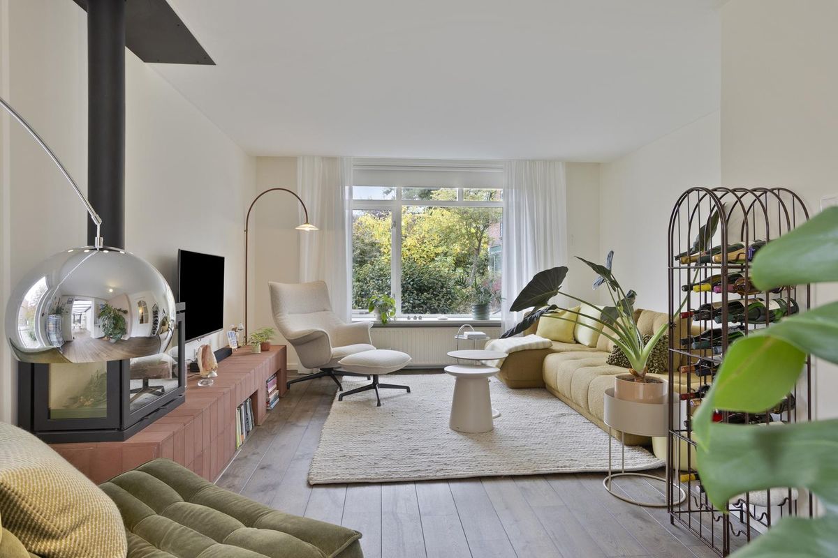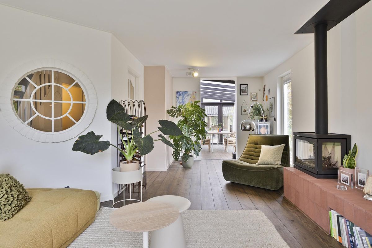 Via de hal met terrazzo vloer en karakteristiek rond raam komt u binnen in de woning. De woonkamer is voorzien van een moderne houtkachel en uitzicht op het groen aan de voorzijde. De open doorgang naar de glazen serre maakt deze ruimte extra bijzonder, ideaal om te tafelen en van de natuur te genieten. De volledig nieuwe luxe keuken (2025) beschikt over een warme donkerbruine houtlook, luxe inbouwapparatuur zoals Bora 4-pits inductiekookplaat met geïntegreerde afzuiging, koelkast, vriezer, vaatwasser en combi-oven/magnetron. Vanuit de keuken is de wasruimte en het separate toilet bereikbaar.