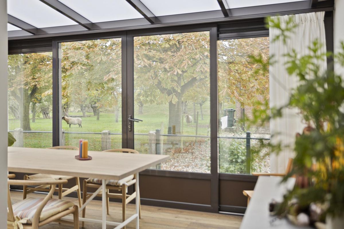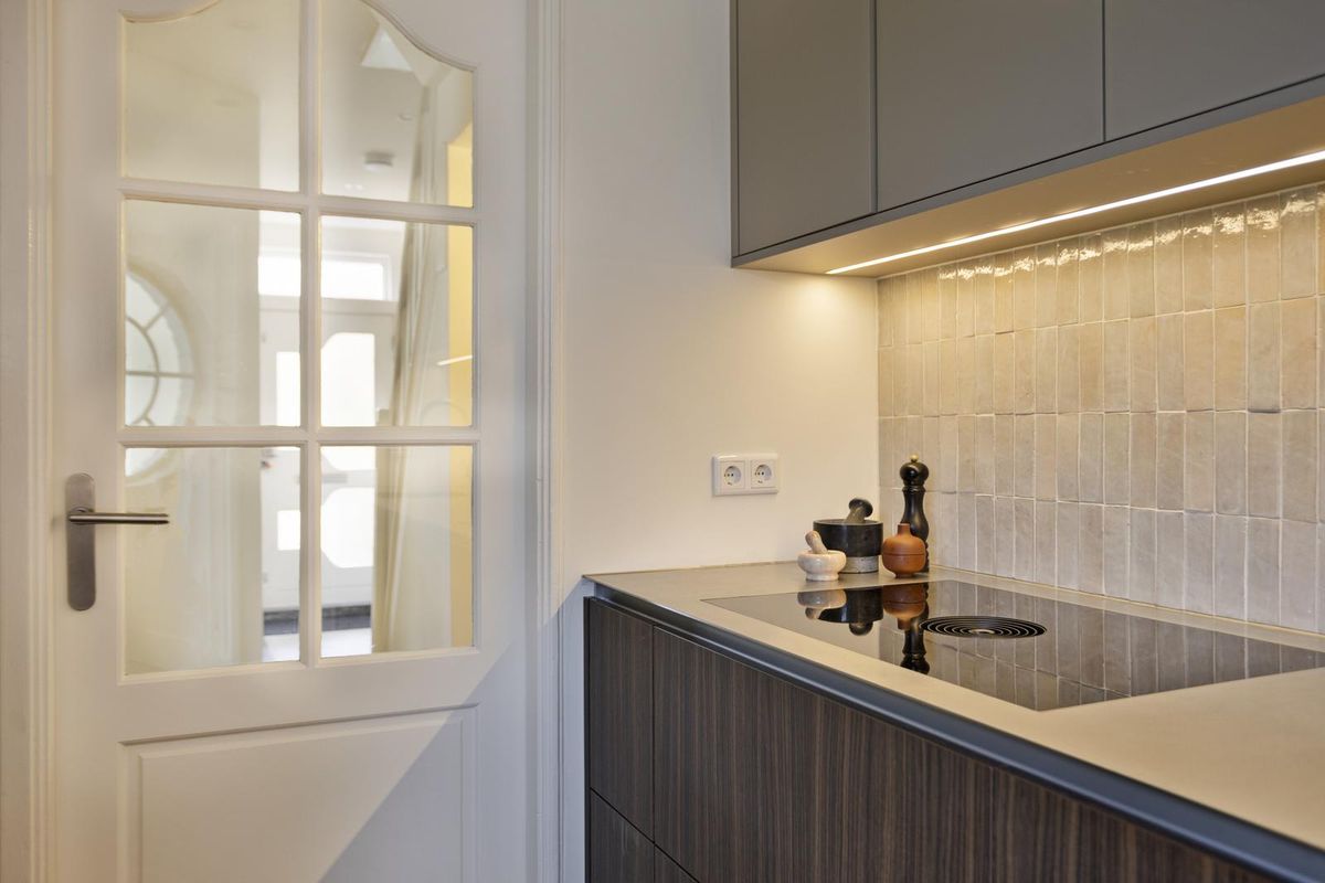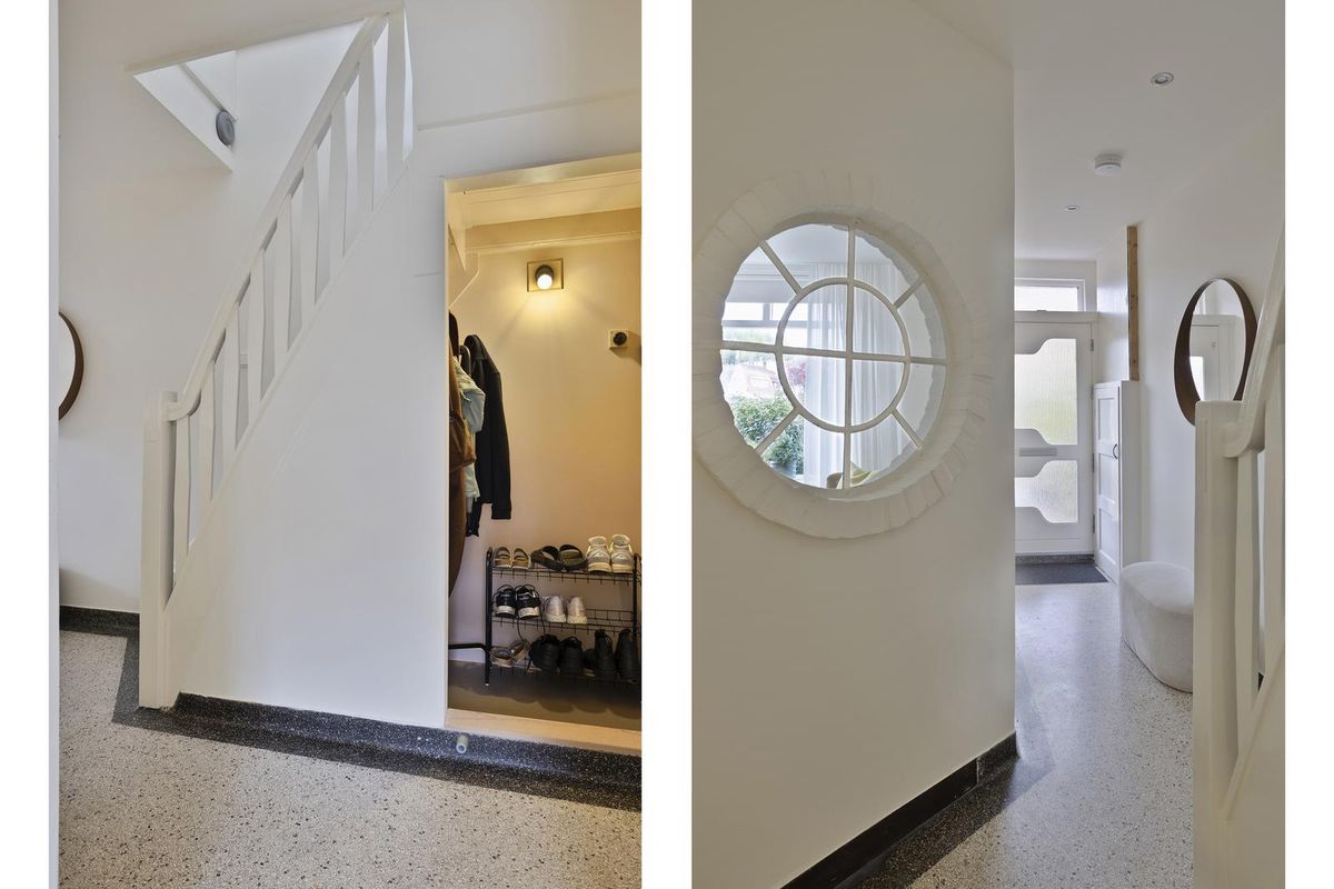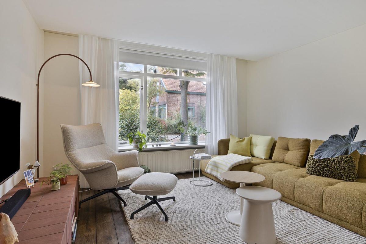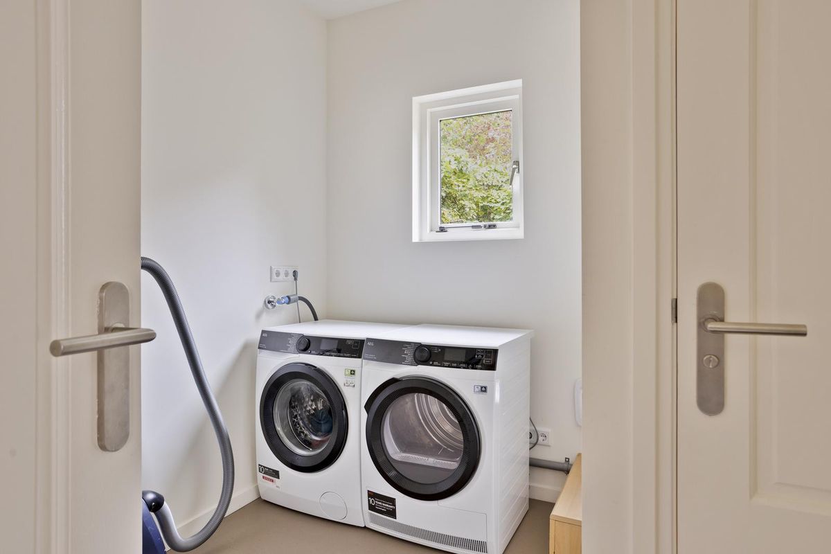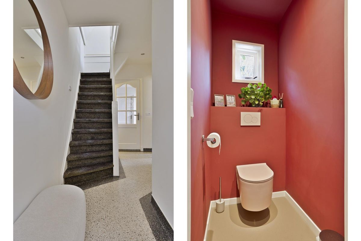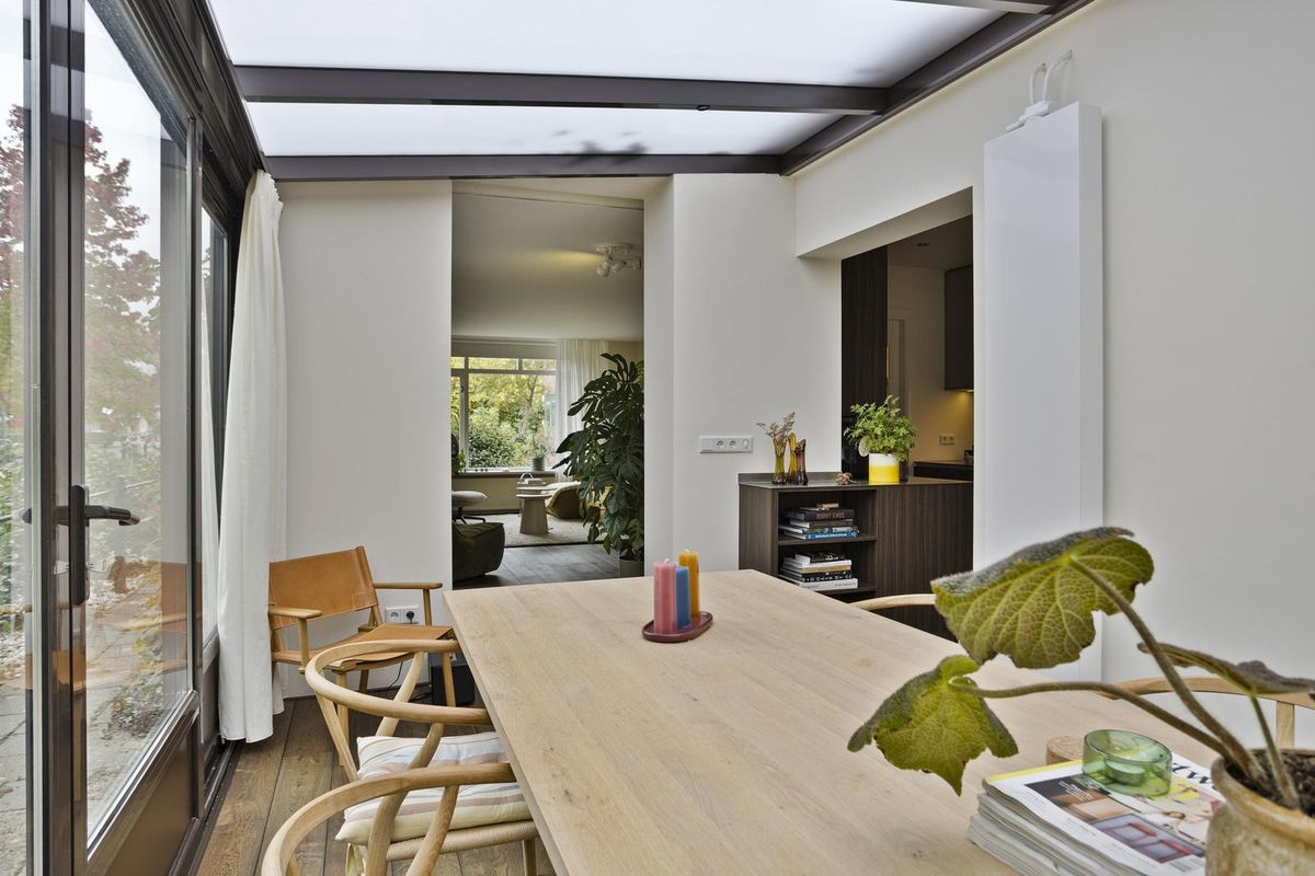 Via de hal met terrazzo vloer en karakteristiek rond raam komt u binnen in de woning. De woonkamer is voorzien van een moderne houtkachel en uitzicht op het groen aan de voorzijde. De open doorgang naar de glazen serre maakt deze ruimte extra bijzonder, ideaal om te tafelen en van de natuur te genieten. De volledig nieuwe luxe keuken (2025) beschikt over een warme donkerbruine houtlook, luxe inbouwapparatuur zoals Bora 4-pits inductiekookplaat met geïntegreerde afzuiging, koelkast, vriezer, vaatwasser en combi-oven/magnetron. Vanuit de keuken is de wasruimte en het separate toilet bereikbaar.