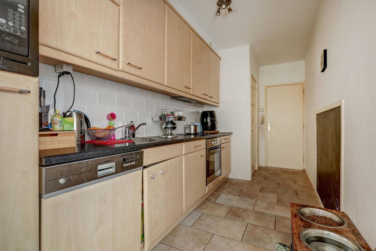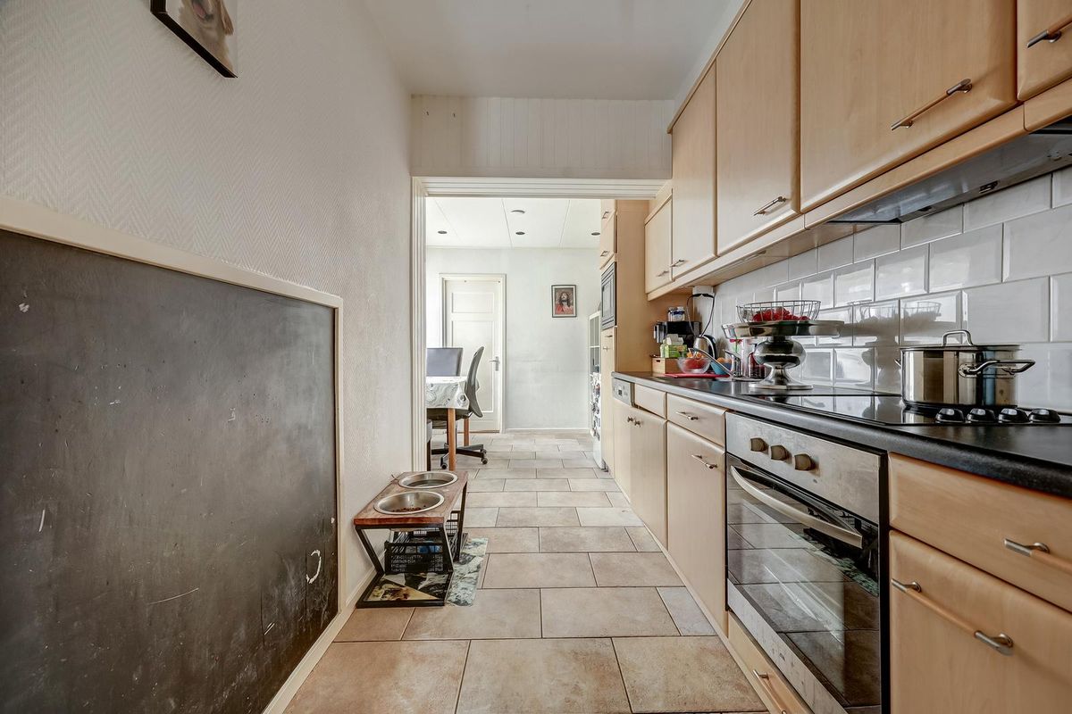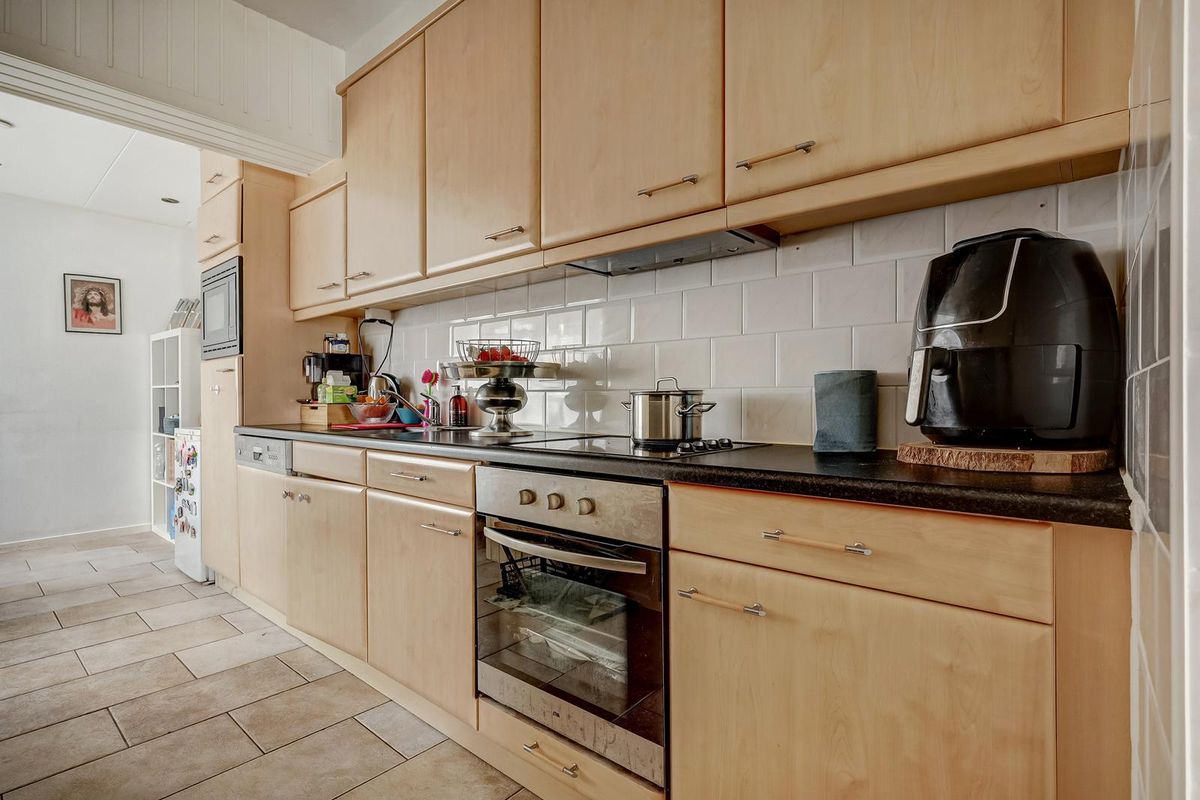 De keuken bevindt zich aan de achterzijde van de woning en is uitgevoerd in een lichte houttint met een donker werkblad. De keuken is voorzien van diverse inbouwapparatuur zoals een oven, magnetron, kookplaat, afzuigkap, koelkast en vaatwasser. Vanuit de keuken loopt u door naar de bijkeuken, waar ruimte is voor de wasmachine en extra opbergruimte. Aansluitend bevindt zich de badkamer, uitgerust met een ligbad, aparte douchecabine en wastafelmeubel. De combinatie van lichte wandtegels en een warme vloertegel zorgt voor een tijdloze uitstraling.