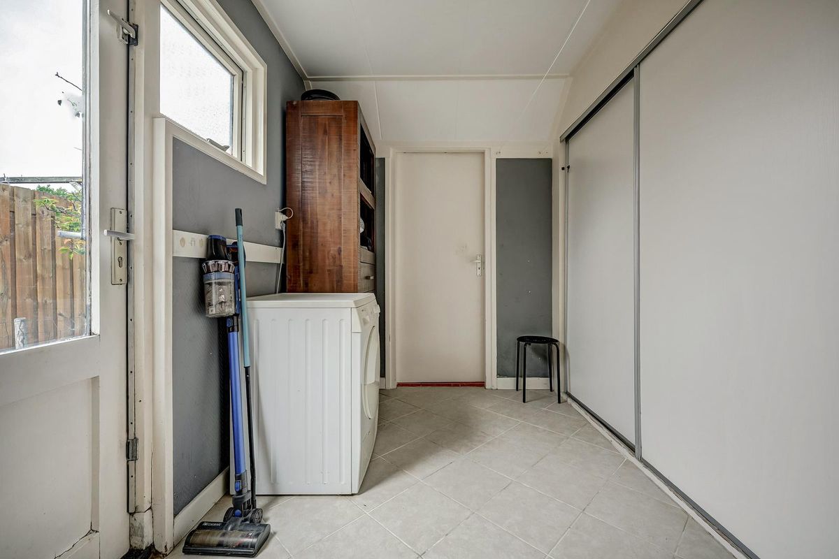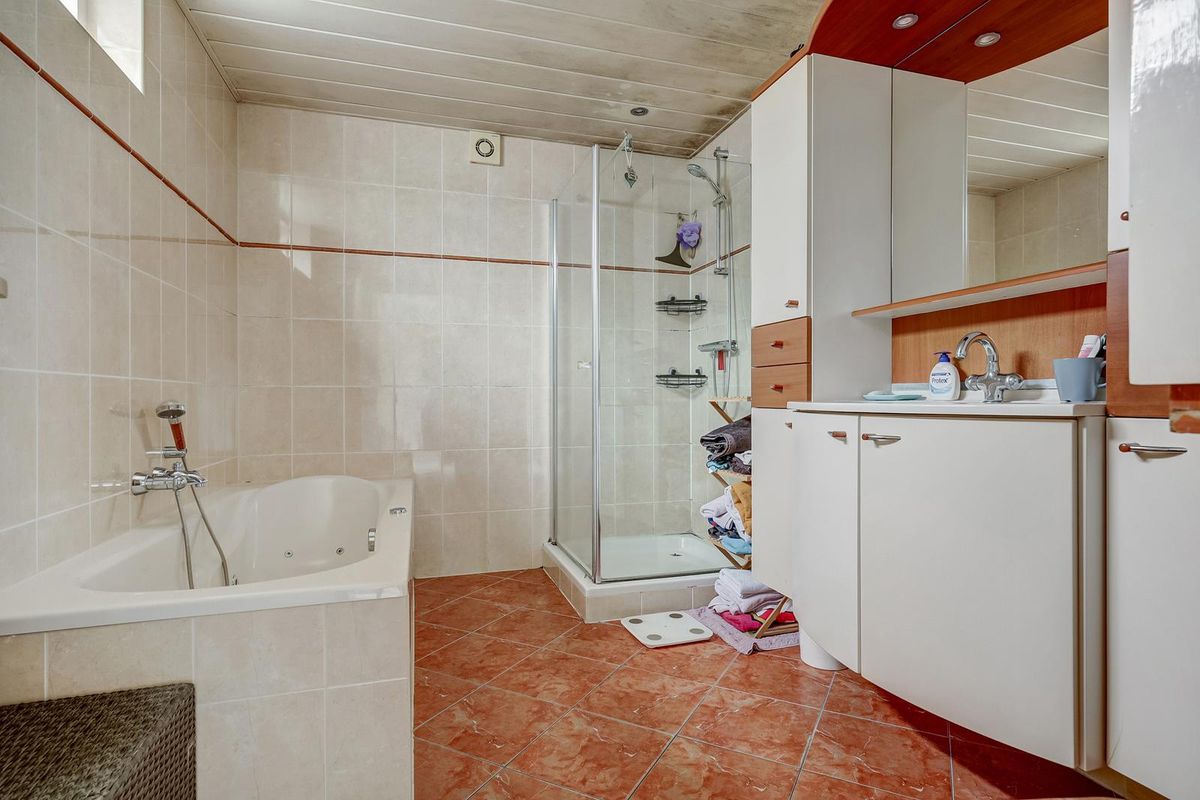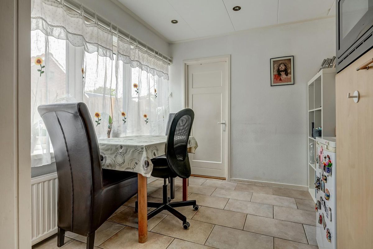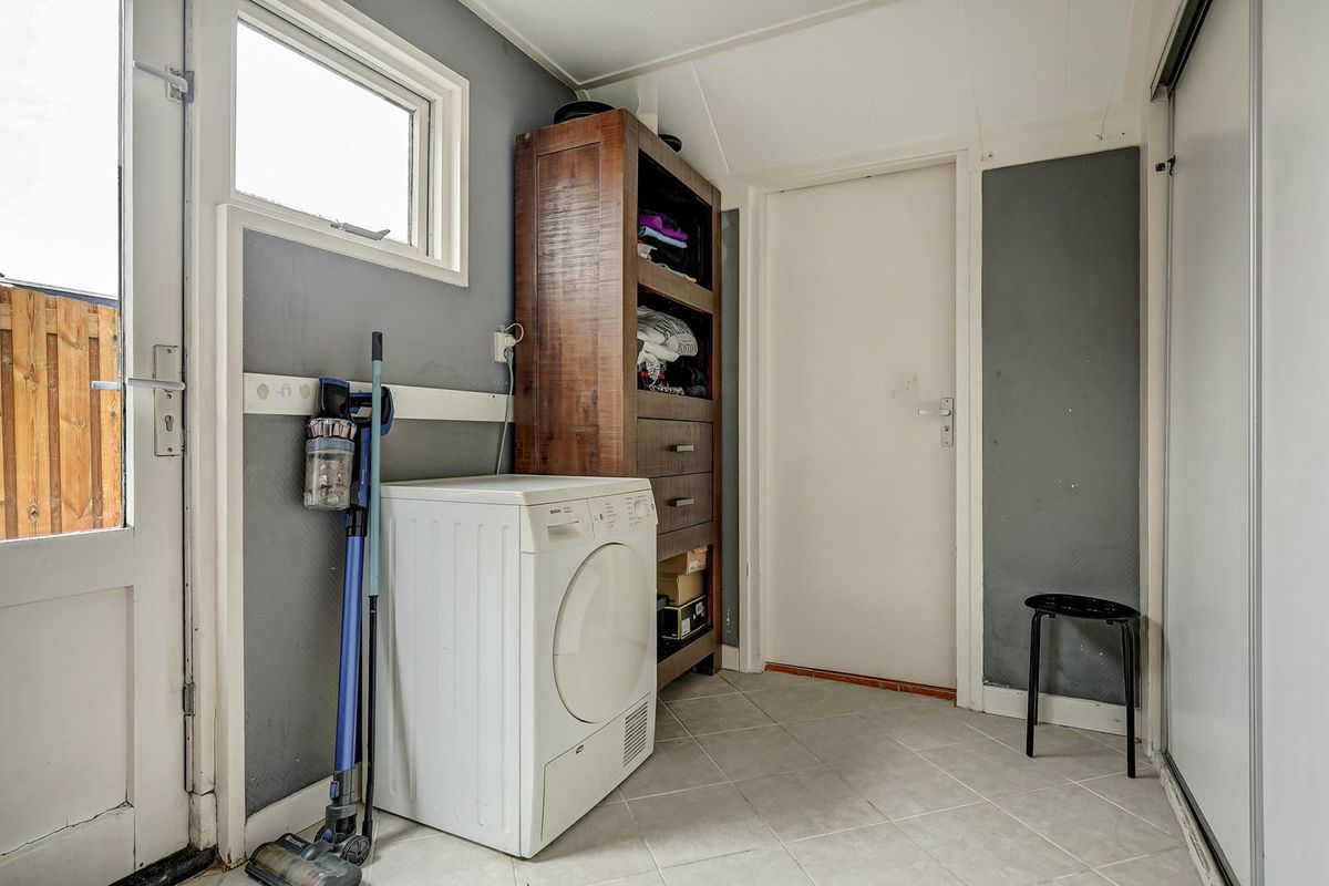 De keuken bevindt zich aan de achterzijde van de woning en is uitgevoerd in een lichte houttint met een donker werkblad. De keuken is voorzien van diverse inbouwapparatuur zoals een oven, magnetron, kookplaat, afzuigkap, koelkast en vaatwasser. Vanuit de keuken loopt u door naar de bijkeuken, waar ruimte is voor de wasmachine en extra opbergruimte. Aansluitend bevindt zich de badkamer, uitgerust met een ligbad, aparte douchecabine en wastafelmeubel. De combinatie van lichte wandtegels en een warme vloertegel zorgt voor een tijdloze uitstraling.