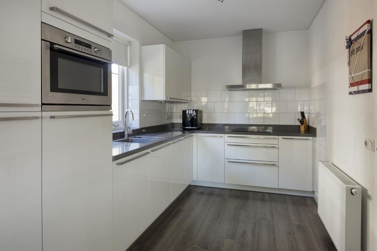 De moderne witte keuken is praktisch ingericht, voorzien van diverse inbouwapparatuur en grenst aan de eetruimte, dé plek voor gezellige familiemomenten.